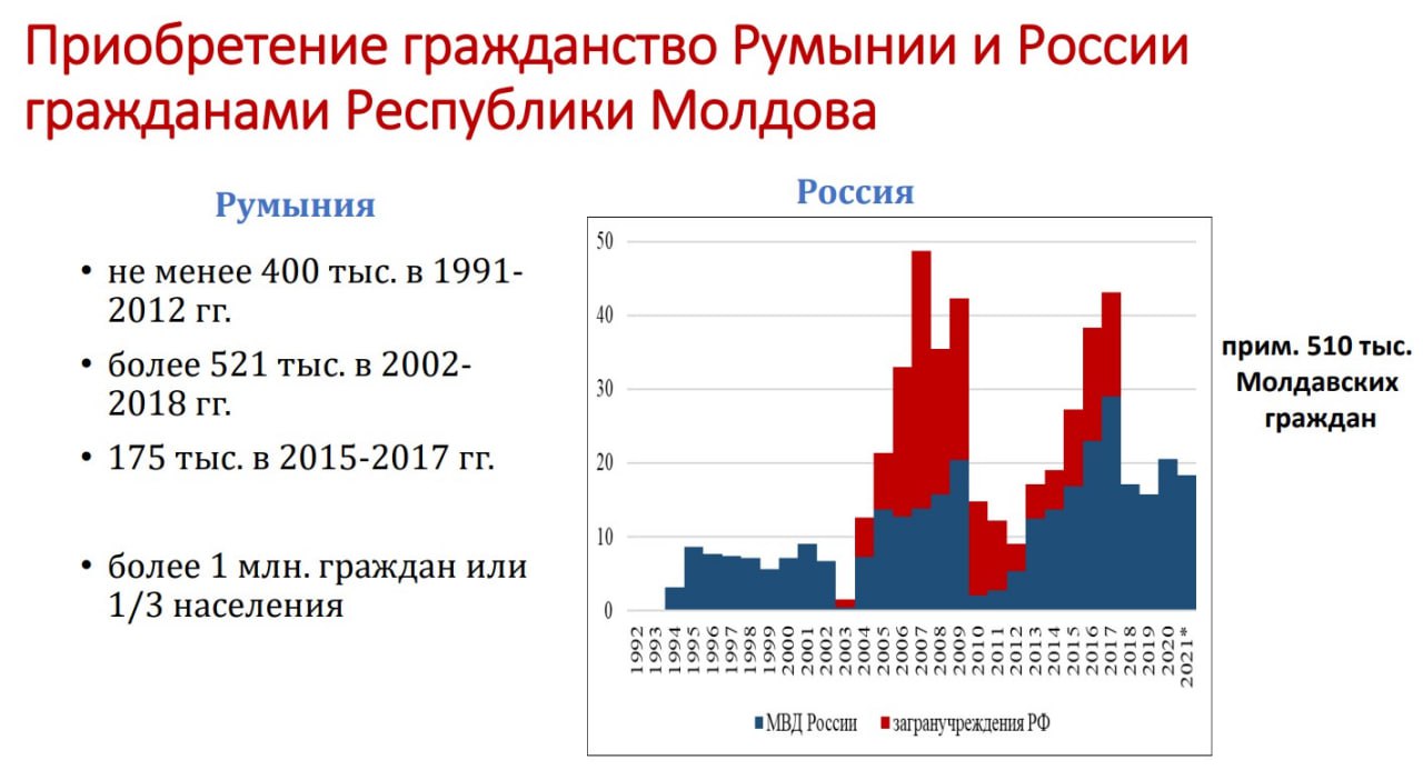 Ещё молдаване выбили из старшей сестры Румынии приобретение гражданства их страны. Румынский паспорт имело к 2021 году более 1/3 населения Молдавии, т.е. скорее всего все трудоспособные и активные.