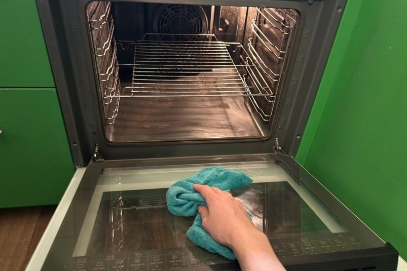 При этом не нужно давать составу высохнуть, пусть он "варится" в духовке в течение 20 минут. Проверить палочкой от суши или деревянной шпажкой: если жирный налет на стекле размягчился, можно приступать к чистке.