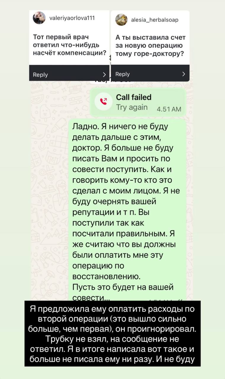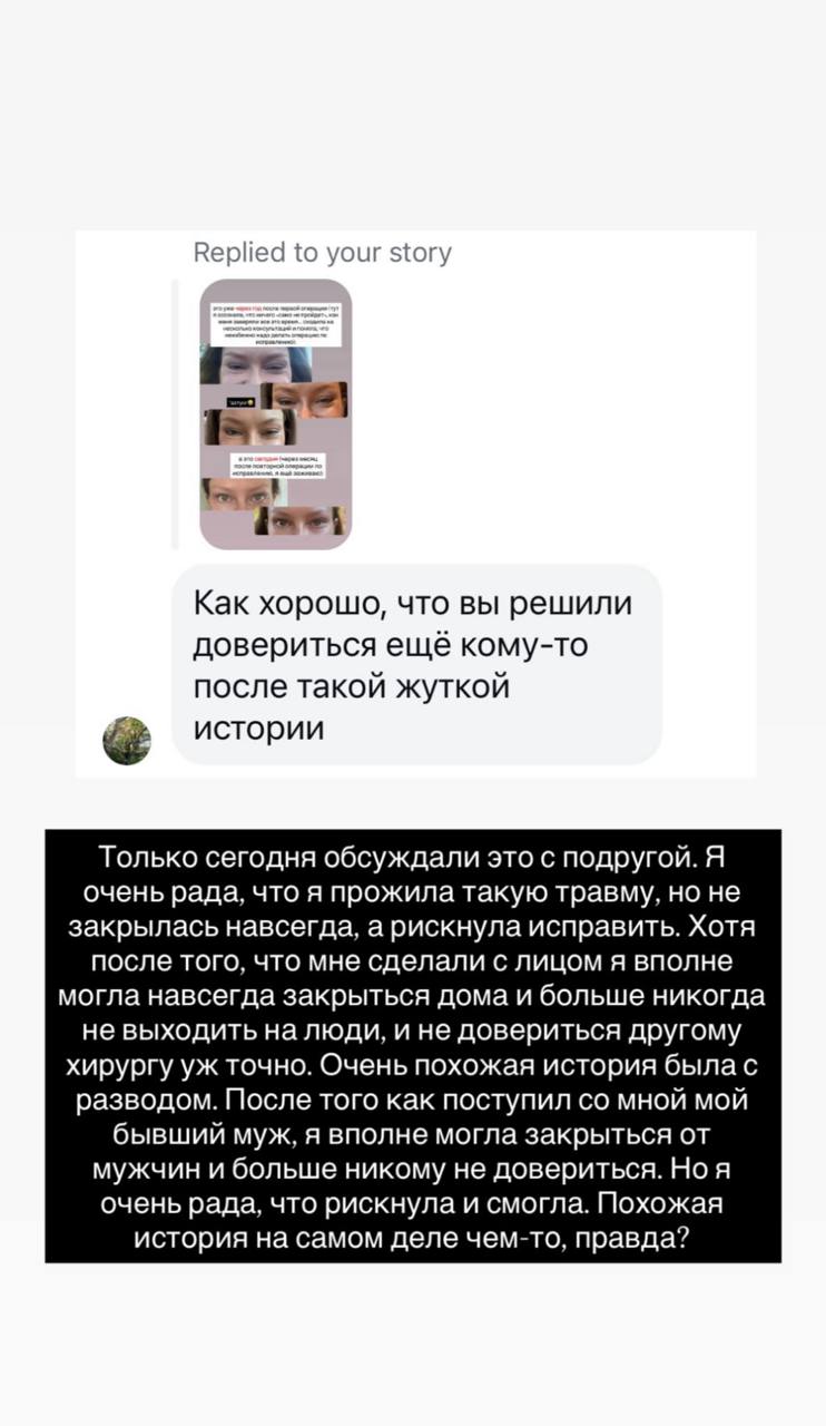 «Я очень рада, что я прожила такую травму, но не закрылась навсегда, а рискнула исправить. Хотя после того, что мне сделали с лицом я вполне могла навсегда закрыться дома и больше никогда не выходить на люди, и не довериться другому хирургу уж точно. Очень похожая история была с разводом. После того как поступил со мной мой бывший муж, я вполне могла закрыться от мужчин и больше никому не довериться. Но я очень рада, что рискнула и смогла. Похожая история на самом деле чем-то, правда?» — написала Рита.