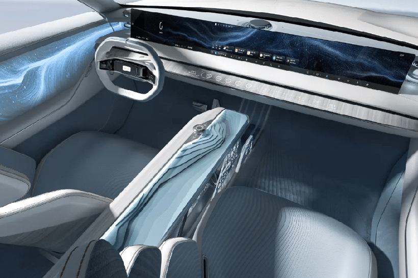 В салоне внимание привлекает огромный дисплей, который тянется через всю переднюю панель. В Geely утверждают, что экран является водонепроницаемым и пылезащитным, а также на нем не остаются следы от пальцев. Очевидно, монитор будет включать в себя как панель инструментов, так и прочие функции. Учитывая, что он доступен и пассажиру, там наверняка будет встроенная развлекательная система.