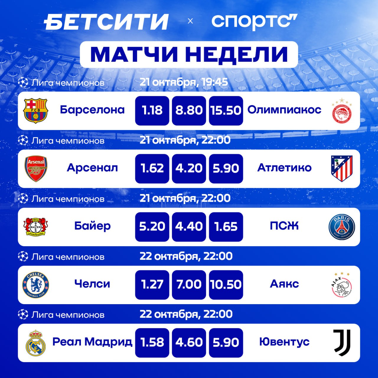 Спортс“ | Лига чемпионов4 часа назад ФОТО 🇪🇺❤️ Лучший турнир вселенной возвращается: смотрим топ-матчи Лиги чемпионов из Лондона, Мадрида и Барселоны!➡️ Ставьте на матчи Лиги чемпионов с фрибетом 1500 рублей в БЕТСИТИ Темы и тегиЛондонСпорттоп-матч лига чемпион вселенная возвращение турнир фрибет хороший БЕТСИТИ