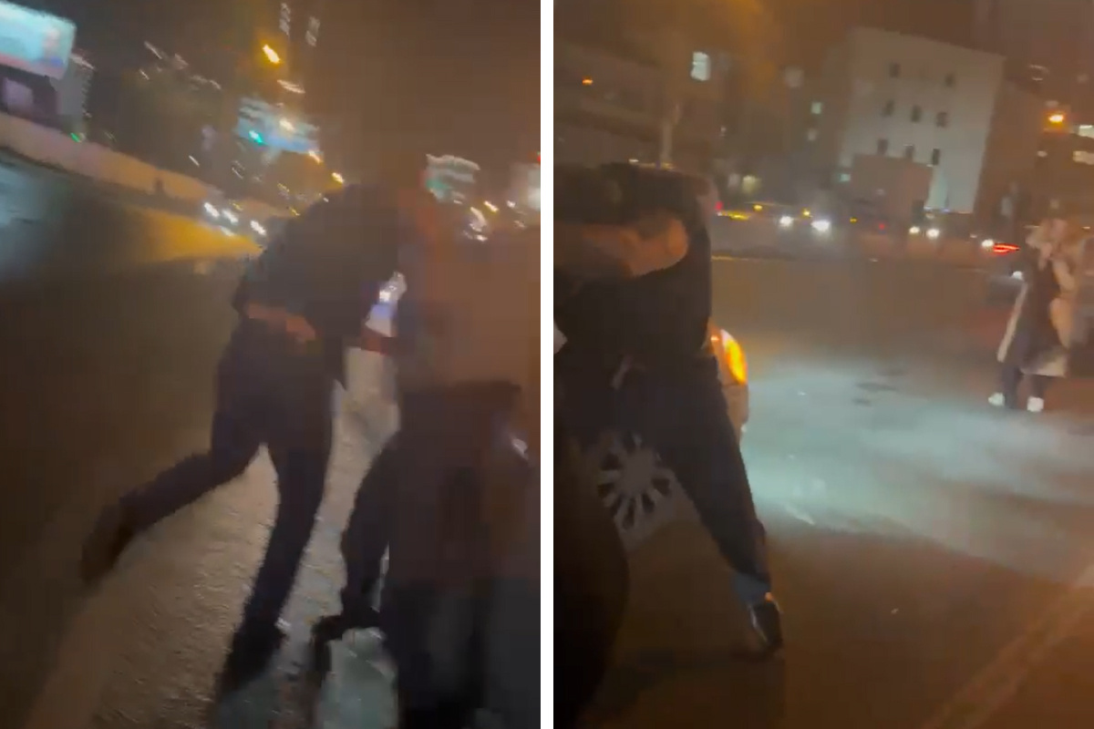 На кадрах можно услышать словесную перепалку между двумя водителями, во время которой один из них предлагает «остановиться и поговорить». После того, как загорелся зеленый сигнал светофора, водитель внедорожника движется вперед и пытается проехать перед другой машиной. Следующая запись снята уже во время потасовки.