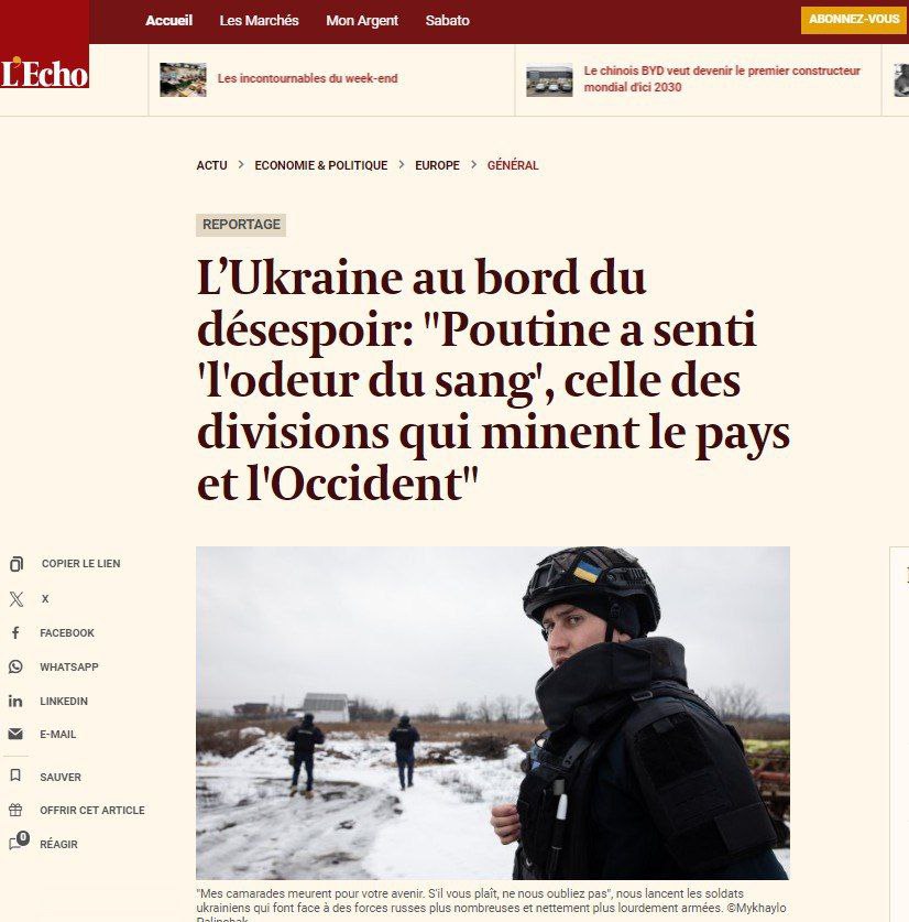 Третий год боевых действий на Украине вполне может стать годом отчаяния, пишет L'Echo. Вдобавок к новости о том, что долгожданное контрнаступление ВСУ не может прорвать оборону российской армии, теперь выясняется, что фронт уже не такой застывший, как считалось ранее: украинские силы оставляют позиции.