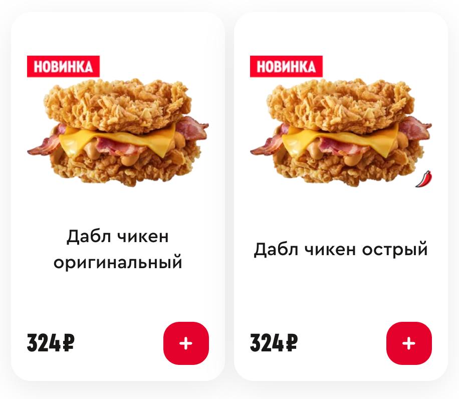 В бывший KFC завезли бургеры без булок: согласно меню, это пара кусков филе в хрустящей панировке с беконом, ломтиком Чеддера и соусом.