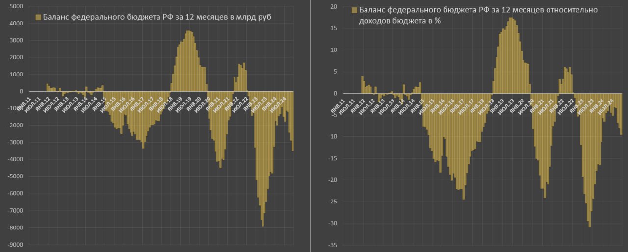 Ускорение годового дефицита (по 12-месячной скользящей средней) началось с середины 2024 (тогда дефицит балансировал на уровне 1-1.5 трлн), а пиковый дефицит был в мае 2023 на уровне 7.9 трлн.