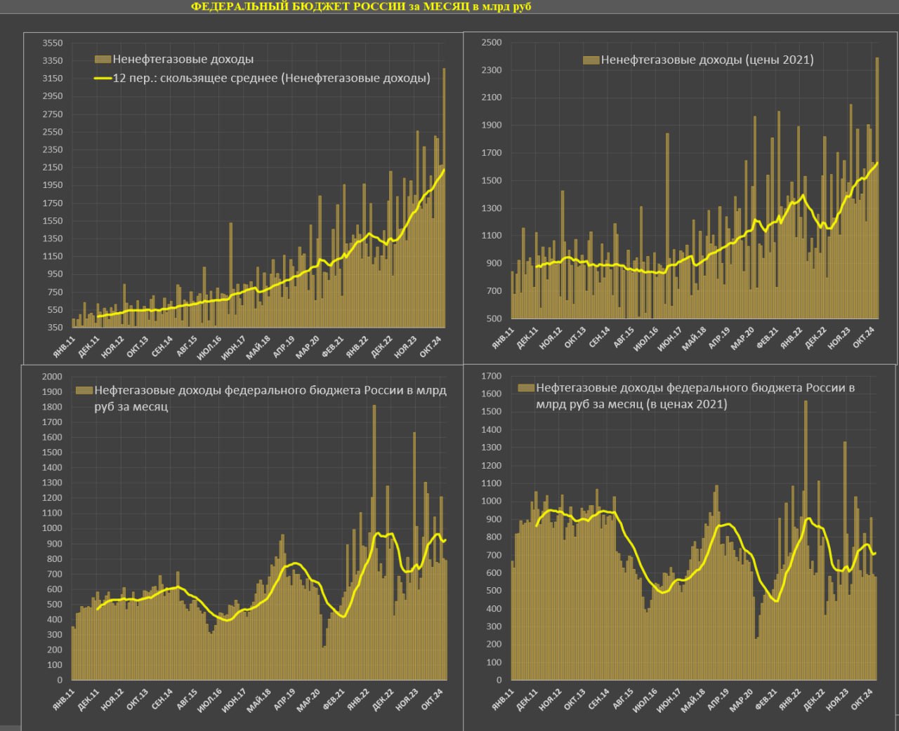 За весь 2024 год совокупные доходы бюджета выросли до 36.7 трлн (+26 г/г и +31.9% за два года), из которых нефтегазовые доходы 11.1 трлн (+26.2% г/г и -3.9% к 2022), а ненефтегазовые доходы 25.6 трлн (+26% г/г + 57.5% за два года).