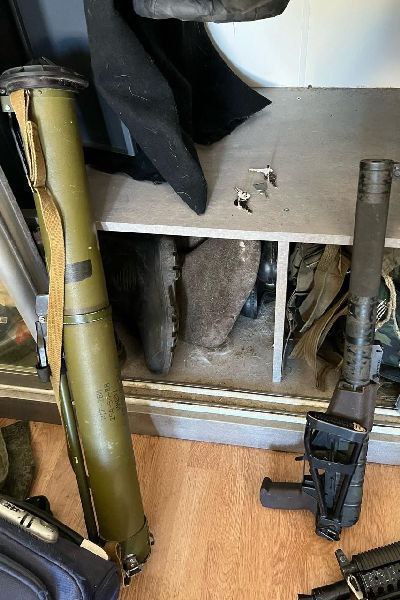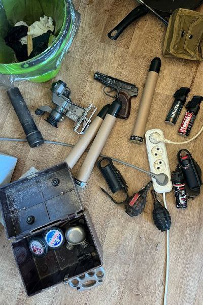 При дальнейшем обыске в квартире были обнаружены автоматы, пистолеты, гранаты и гранатомёт, нож, кастет, бронежилет и прочая амуниция. В ходе осмотра было установлено, что все эти предметы опасности не представляют — они предназначены для игры в страйкбол.