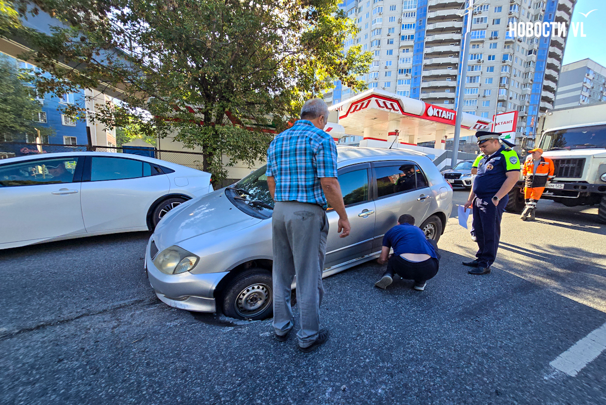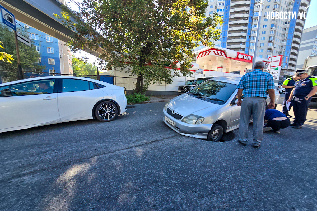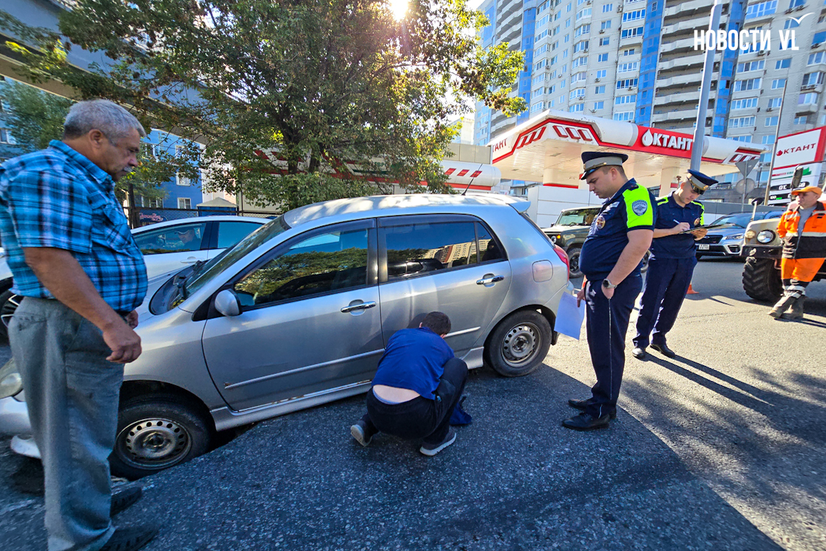 Но вчера люк никто не закрыл. Сегодня около 9 утра в колодец левым колесом попала Toyota Corolla Runx. Машину перекосило, выбраться из ловушки водитель смог только с посторонней помощью. У машины повреждён передний бампер и порог. Очевидцы говорят, что он был не единственным – рядом стояли негодующие водители, оставшиеся без колёс.