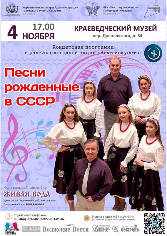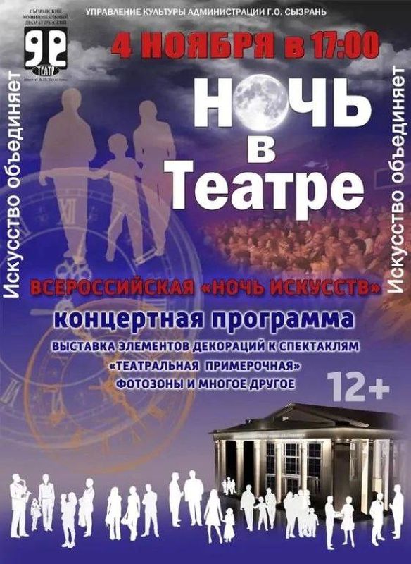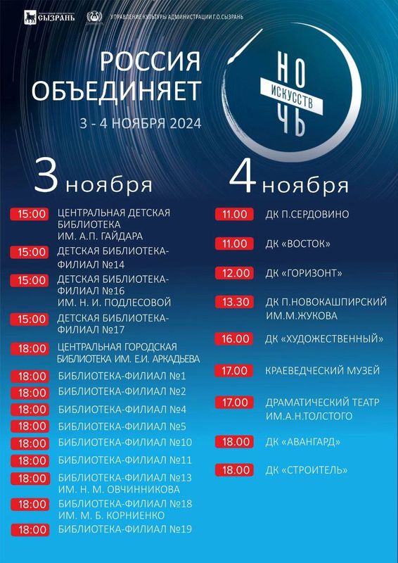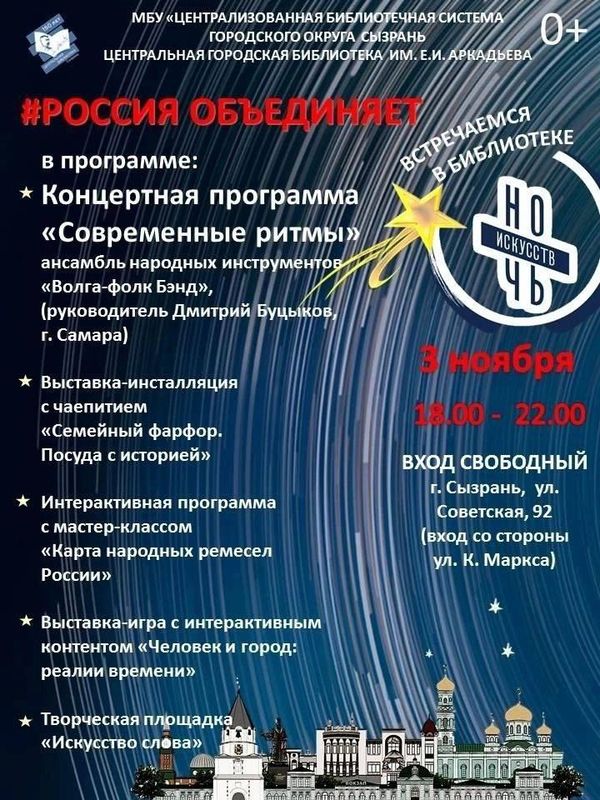 Сегодня, 3 ноября в Сызрани стартует «Ночь искусств» (6+) - Всероссийская акция в честь Дня народного единства. Напомним, что культурно-развлекательная акция пройдет в нашем городе 3 и 4 ноября. Акция пройдет под девизом «Россия объединяет». Мероприятия «Ночи искусств» пройдут в библиотеках, Краеведческом музее, Драматическом театре имени А.Н. Толстого (12+), домах культуры Сызрани. Жителей города ждут разнообразные мероприятия: тематические концерты, выставки, экскурсии, интерактивные площадки, мастер-классы, познавательные викторины и квесты для детей и взрослых. Информация о самых ярких событиях отражена в программах и афишах «Культурно-досугового комплекса» - жителям остается выбрать, куда пойти. Напомним также, что для любителей запостить фотографии с мероприятий в сети предлагают специальные теги: #ночьискусств и #ночьискусств2024.