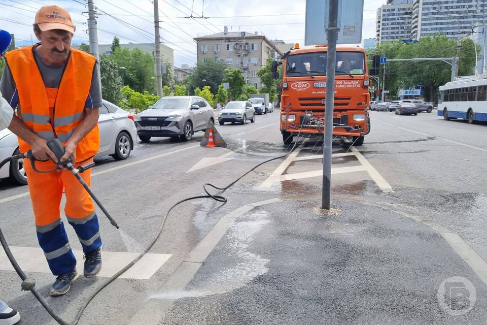 В Волгограде с помощью спецтранспорта муниципальные службы проливают дороги, чтобы сбить жару. Делается это при повышении температуры наружного воздуха выше +30°С.
