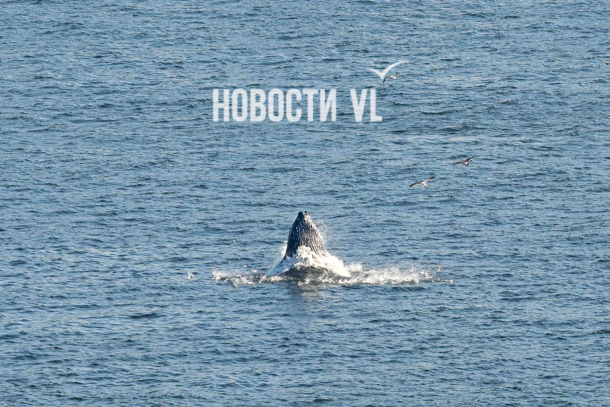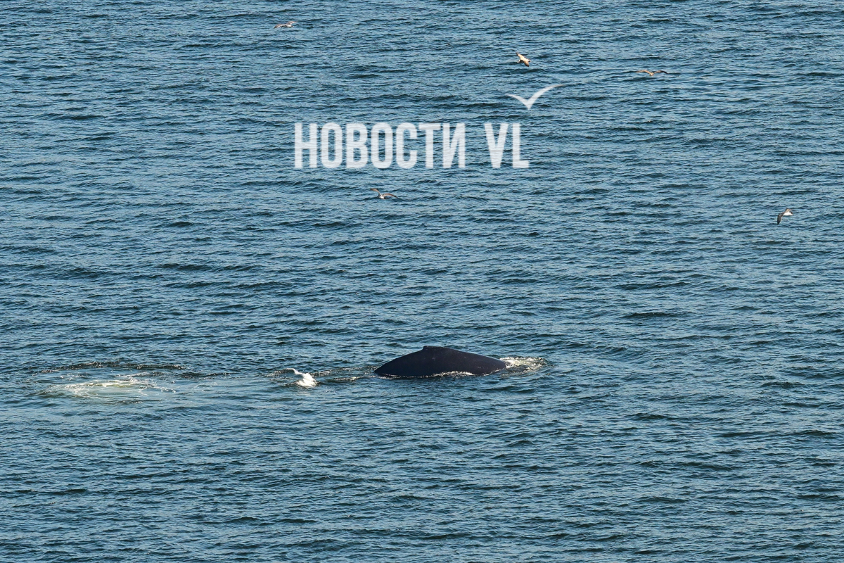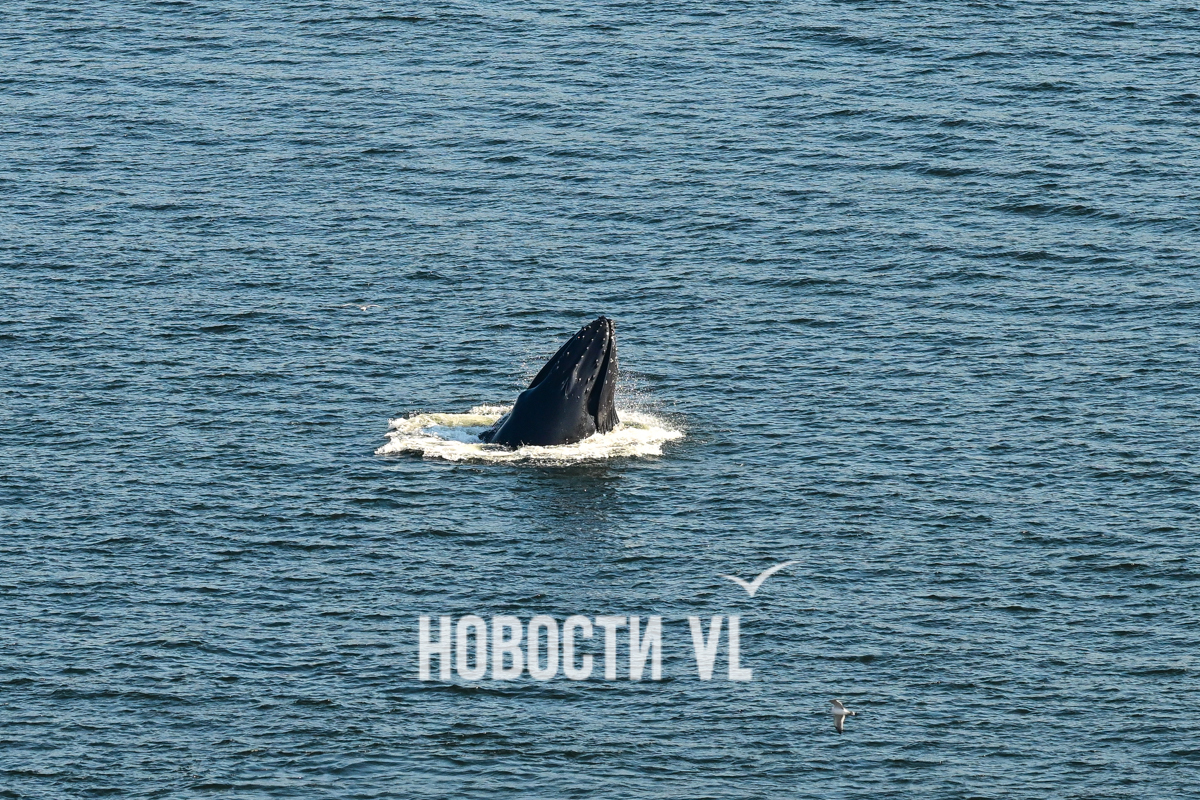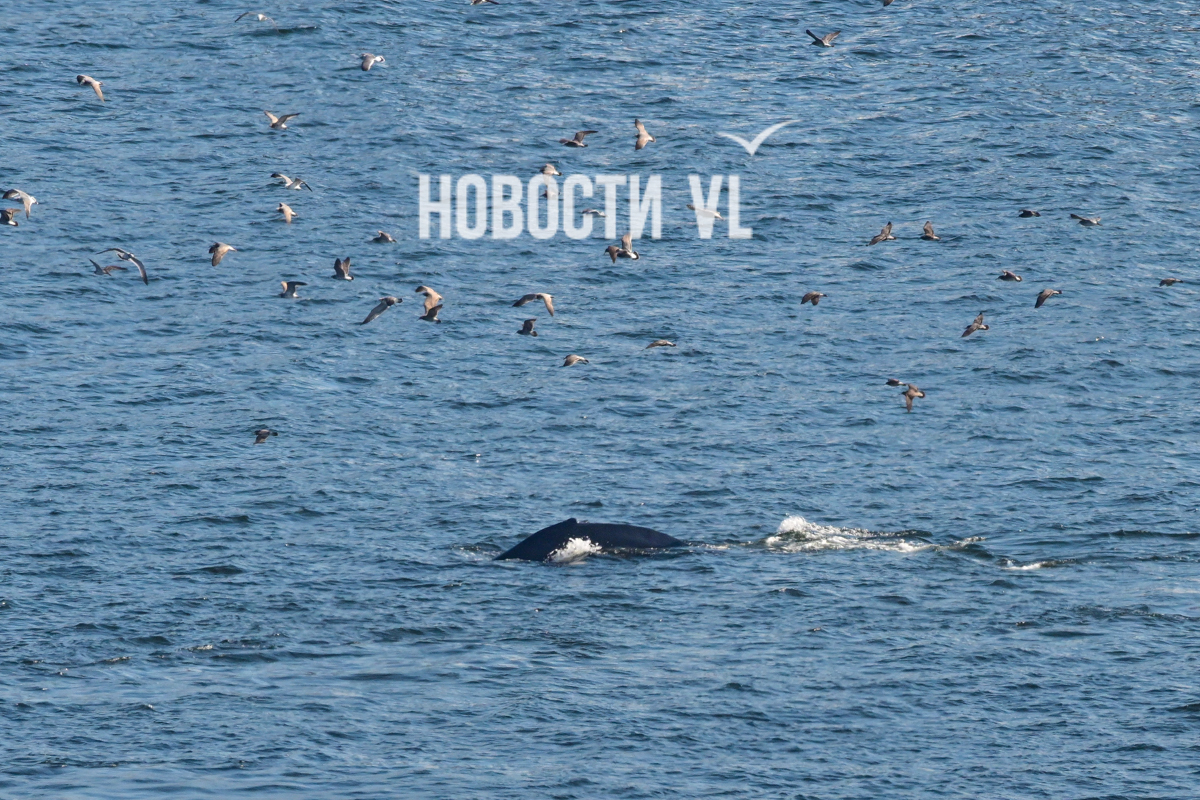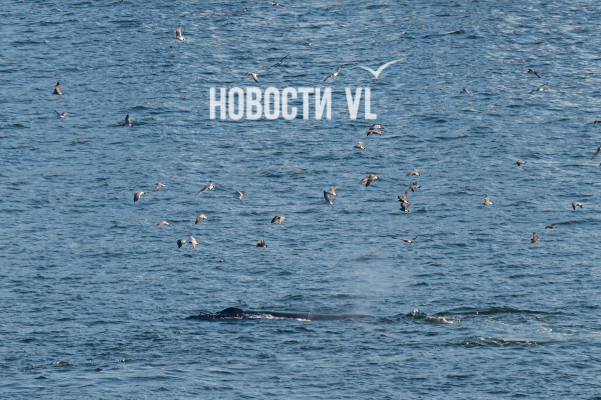 Выглядит и правда впечатляюще. На кадры фотографу Новостей VL попал не только сам кит, но и его потенциальная добыча, выскакивающая из пасти. Пока кит активно лакомился рыбой, рядом с ним всё время кружили чайки, что неудивительно. Чайки обычно подбирают то, что остается от охоты кита. На кадрах видно и бакланов – они ныряют и сами очень активно добывают рыбу из приповерхностного слоя воды поблизости от кормящихся китов.