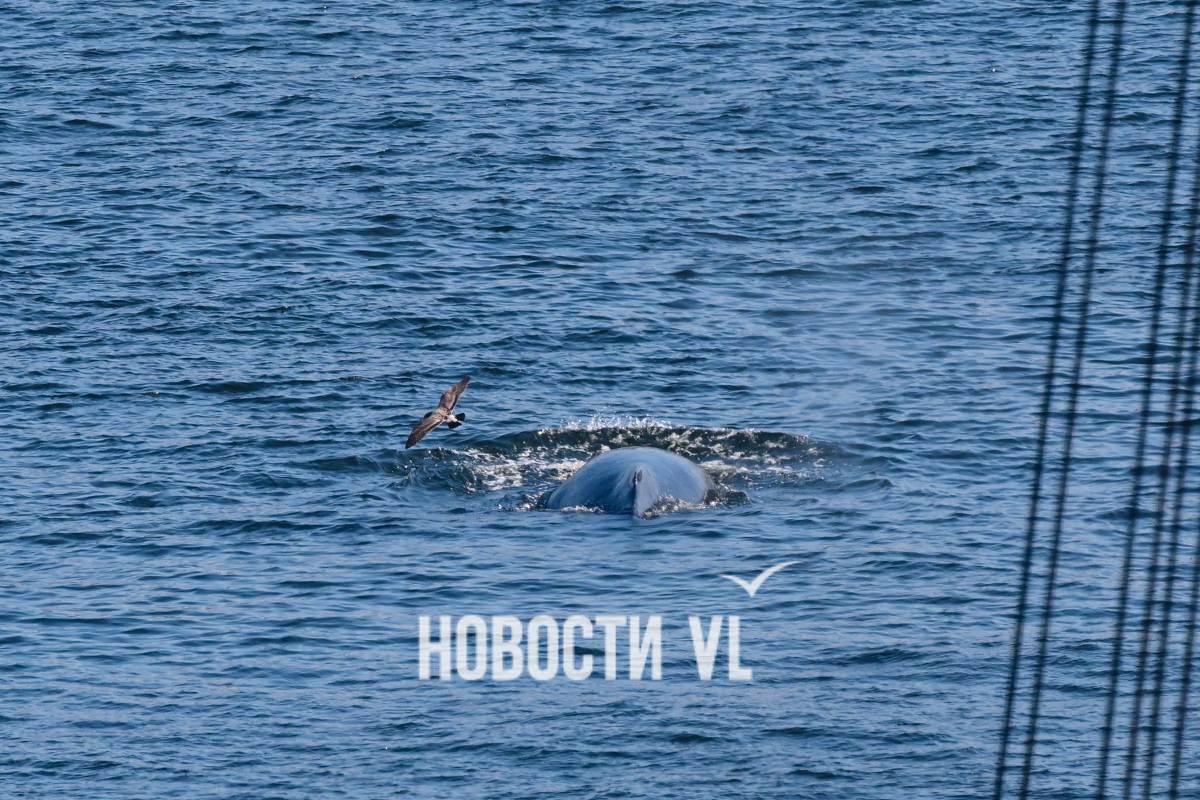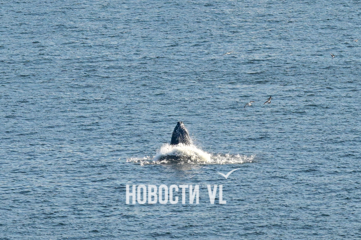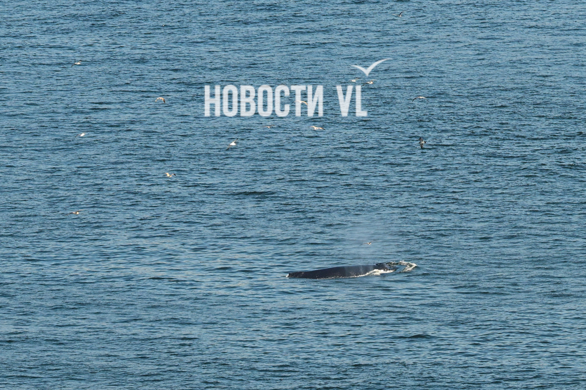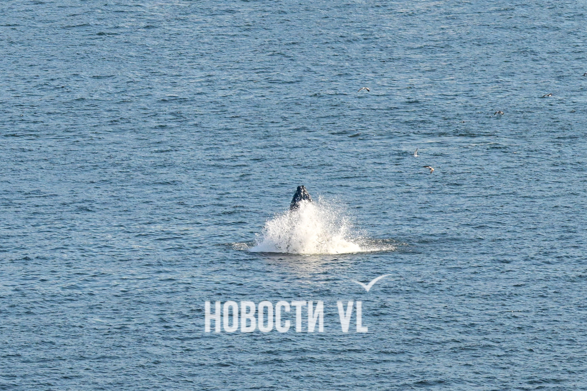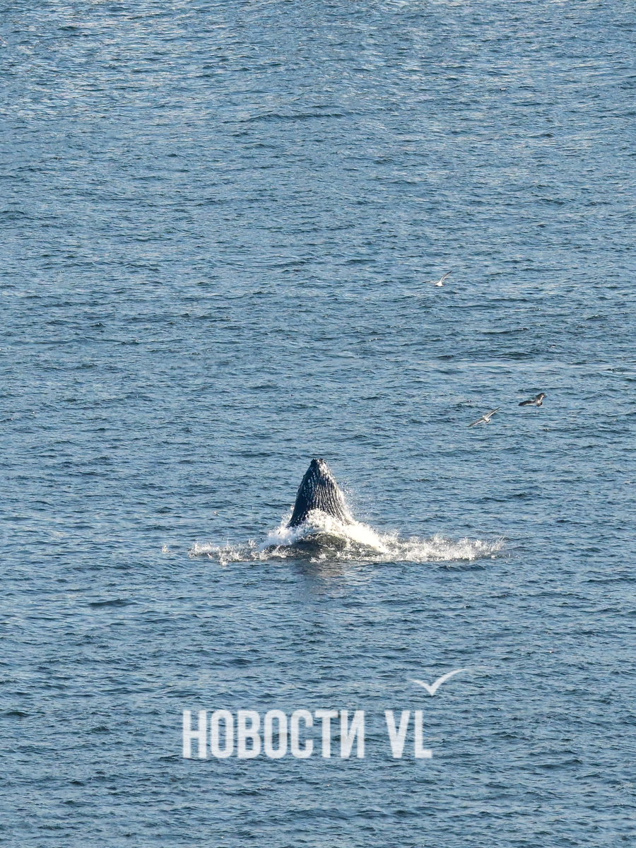 Выглядит и правда впечатляюще. На кадры фотографу Новостей VL попал не только сам кит, но и его потенциальная добыча, выскакивающая из пасти. Пока кит активно лакомился рыбой, рядом с ним всё время кружили чайки, что неудивительно. Чайки обычно подбирают то, что остается от охоты кита. На кадрах видно и бакланов – они ныряют и сами очень активно добывают рыбу из приповерхностного слоя воды поблизости от кормящихся китов.