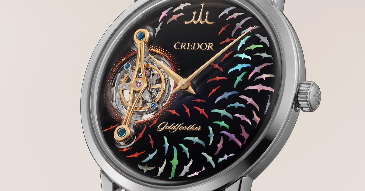 Les paillettes d’or qui entourent la cage du tourbillon sont quant à elles réalisées en maki-e, une technique qui consiste à saupoudrer de la poudre d’or sur la laque. Le mouvement du tourbillon symbolise l’énergie rayonnante du soleil, tandis que le pont du tourbillon prend la forme d’un oiseau en vol, les ailes déployées. En effet, pour la première fois, une montre Credor Goldfeather intègre un tourbillon. Ce nouveau mouvement tourbillon, le calibre 6850, est assemblé par Katsuo Saito, lauréat en 2023 de la Médaille au ruban jaune. Une distinction décernée par le gouvernement japonais aux personnes devenues des modèles publics par leur diligence et leur persévérance dans leur profession.