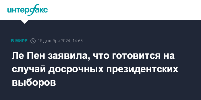 "В качестве меры предосторожности я готовлюсь на случай досрочных президентских выборов", - сказала Ле Пен в интервью газете Le Parisien.