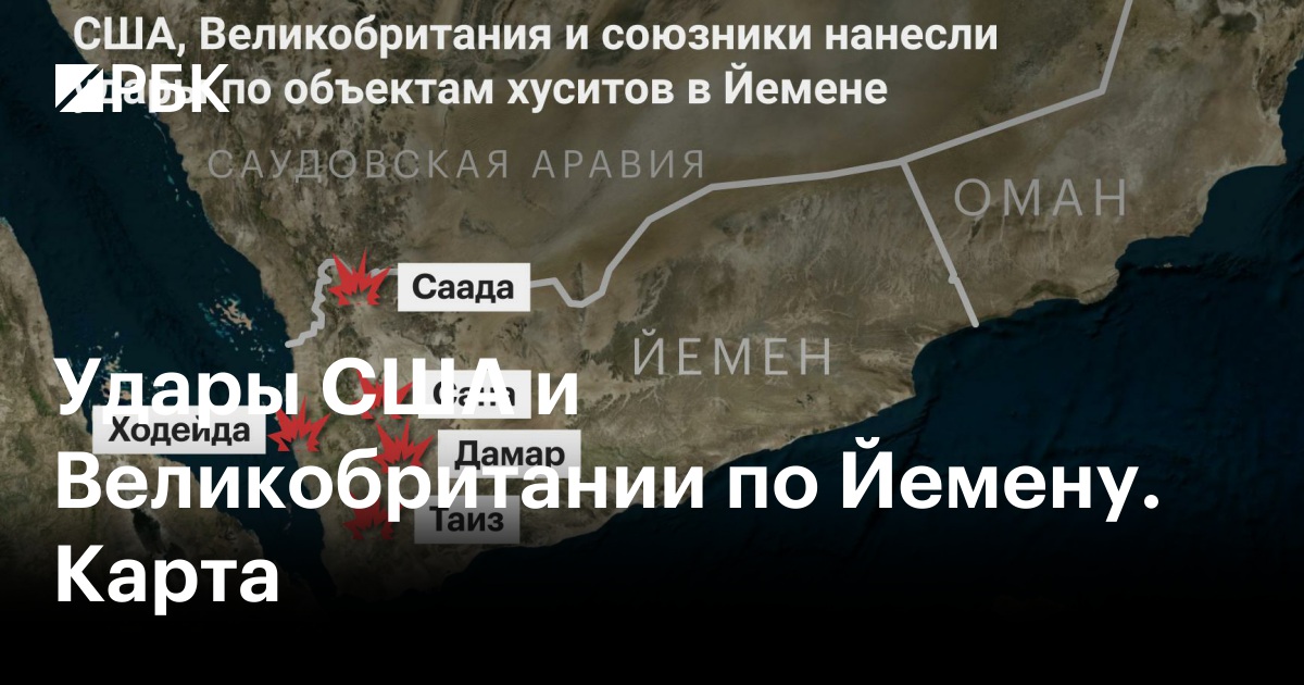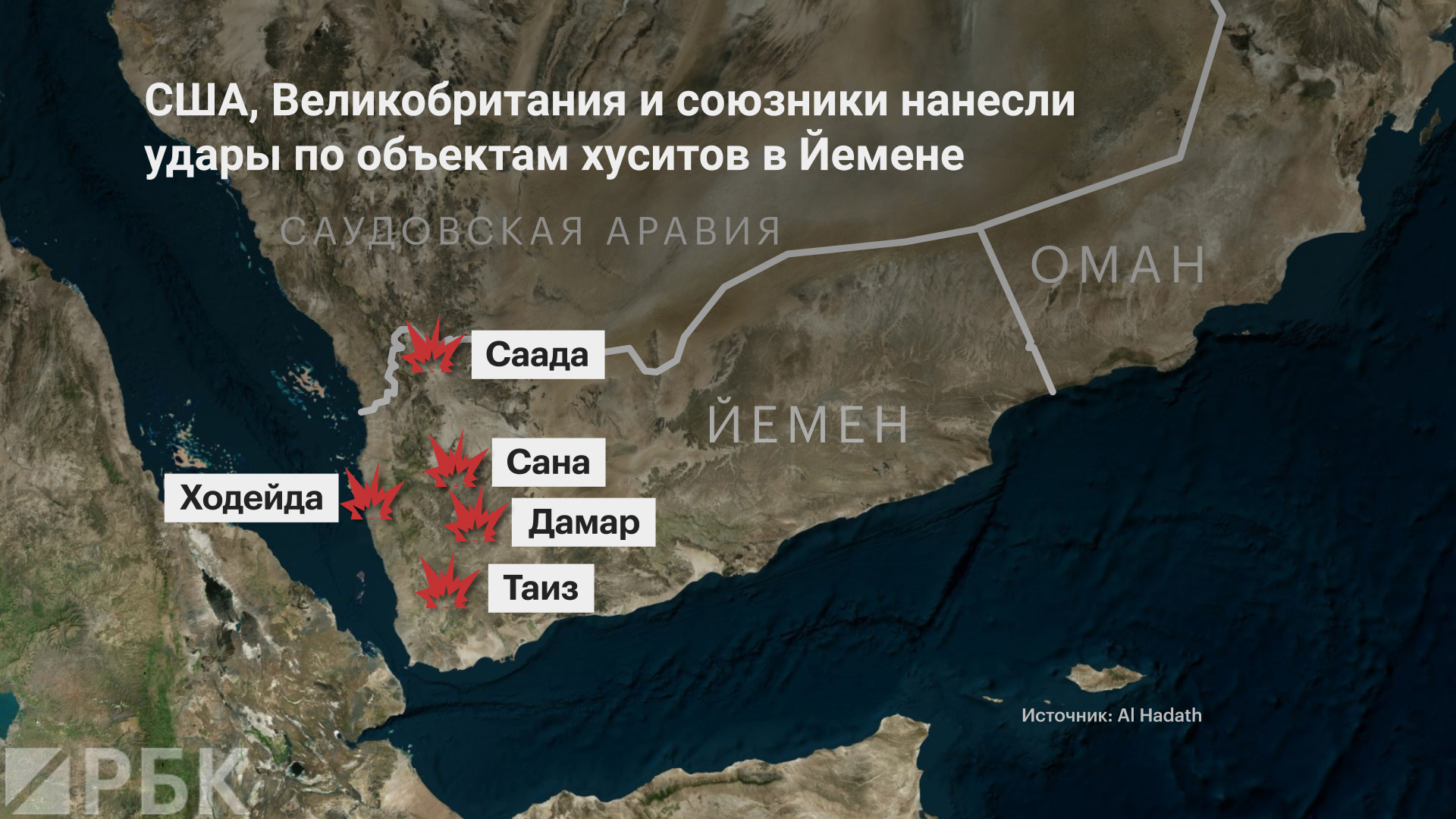 Представители хуситов заявили, что удары пришлись по нескольким объектам в Йемене, передавал CNN. В их числе — авиабаза Аль-Дайлами к северу от столицы Саны, район рядом с международным аэропортом Ходейда на западе Йемена, база хуситов в провинции Саада на севере страны, международный аэропорт Таиз на юго-западе.