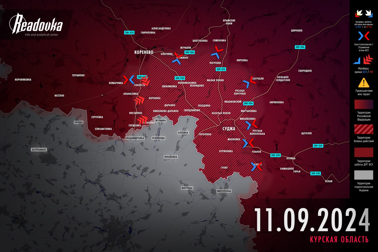 Обстановка в Курской области к утру 11 сентября — пленных, как грибов после дождя Вчерашнее наступление ВДВ и морской пехоты в Кореневском районе вселило в людей осторожный, но оптимизм. Зона присутствия оккупанта в самом деле сузилась с западного фланга благодаря рывковому освобождению сел от Снагости до Гордеевки с севера на юг, и сейчас ведется продвижение с запада на восток, по этой полосе и выше, от Вишневки через Снагость к Любимовке, с промежуточной точкой в Зеленом Шляхе, который является ключом к следующему куску. Одновременно на другом участке у границы, в Суджанском районе, идет «заруба» в приграничных Борках. К утру появилось много текстовых и видеосвидетельств о большом числе захваченных пленных. «Экскурсия» по «Курщине» закончилась