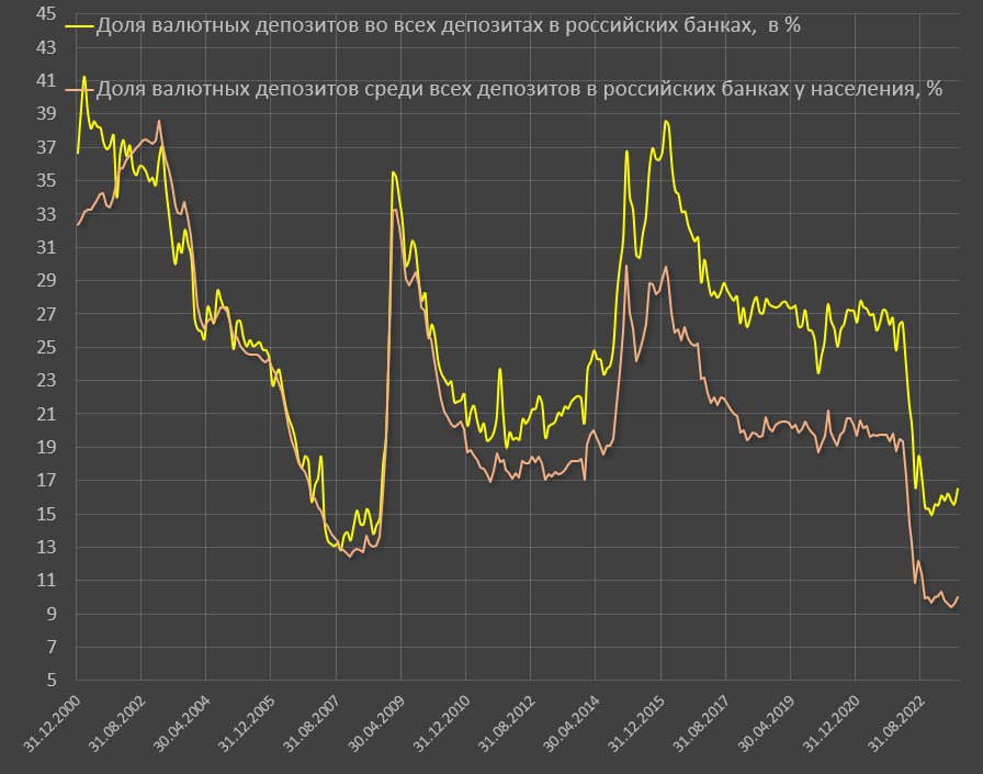 В 2022 российские банки сделали максимально неприемлемые условия удержания валютных активов внутри российской финансовой системы, в том числе по объективным причинам блокирования внешнего фондирования и невозможности балансировать открытую валютную позицию. В итоге доля валютных депозитов снизилась до 16.5% для всех экономических агентов и до 10% для населения.