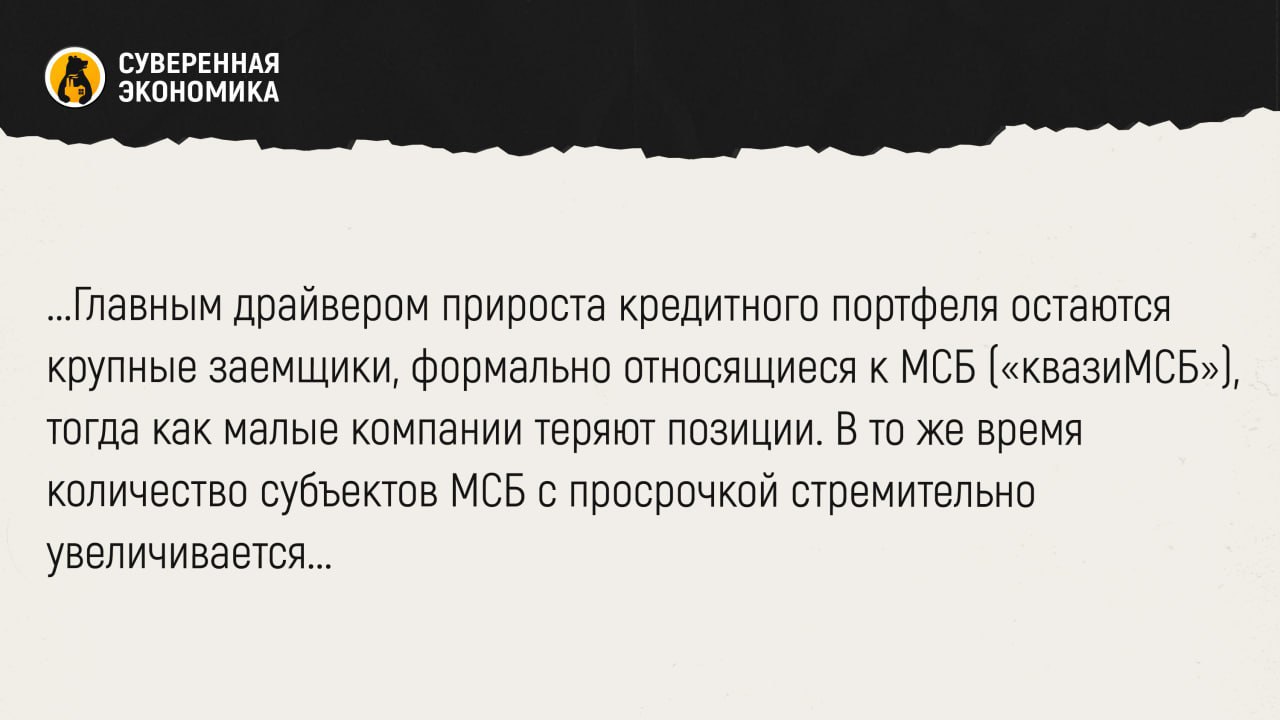 Главным драйвером прироста кредитного портфеля остаются крупные заемщики, формально относящиеся к МСБ («квазиМСБ»), тогда как малые компании теряют позиции. В то же время количество субъектов МСБ с просрочкой стремительно увеличивается — по данным ЦБ, в марте их стало более 123 тыс, и к концу года показатель может превысить 200 тыс.