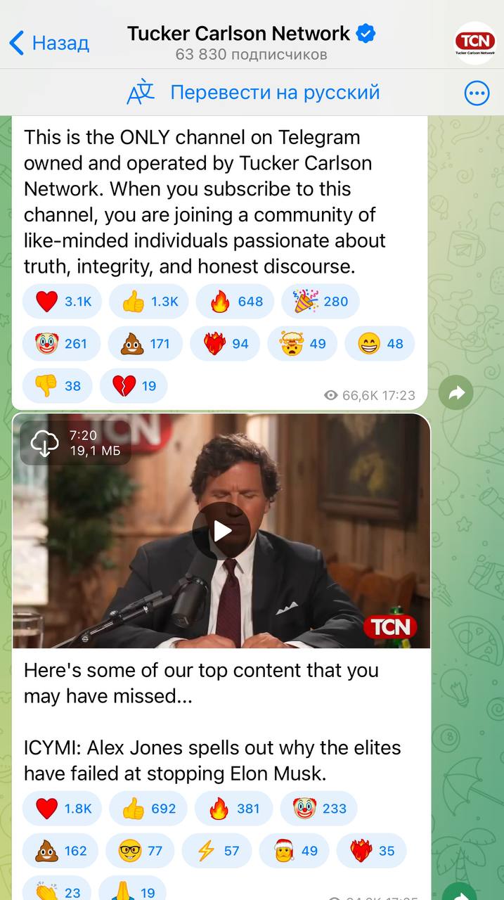 Такер Карлсон взял интервью у Дурова и создал свой канал в ТГ.