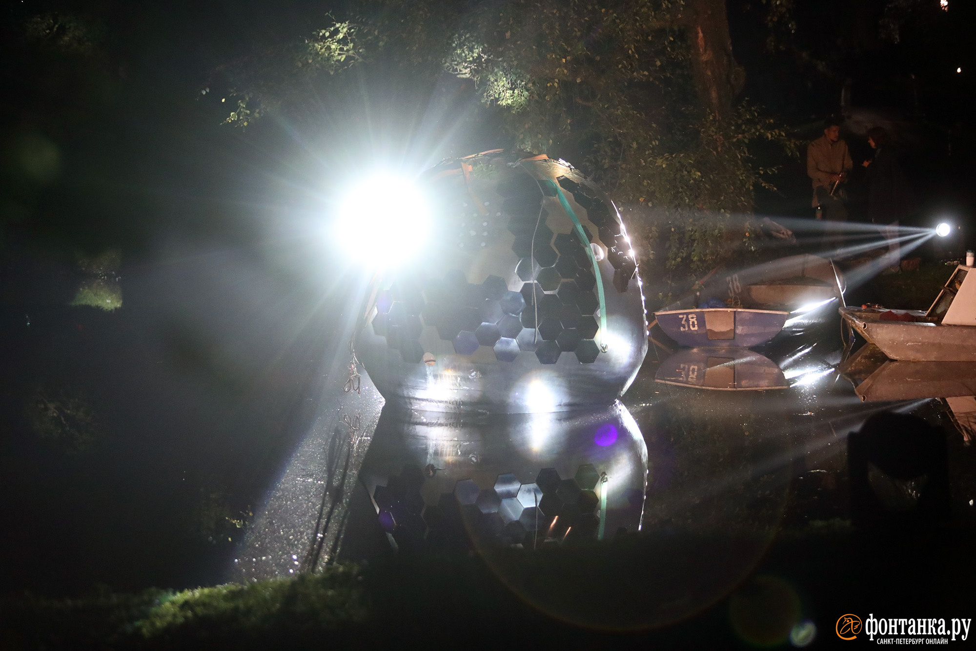 Примерно в этой же части парка на воде сияет иллюминацией прямо-таки настоящая спускаемая капсула космического корабля — инсталляцию «Восток-1» художник доделывает, украшая лампочками, стоя в лодке. В динамике звучит уверенная торжественная речь Юрия Гагарина, а за ней — разочарованные голоса героев «Соляриса» Тарковского.
