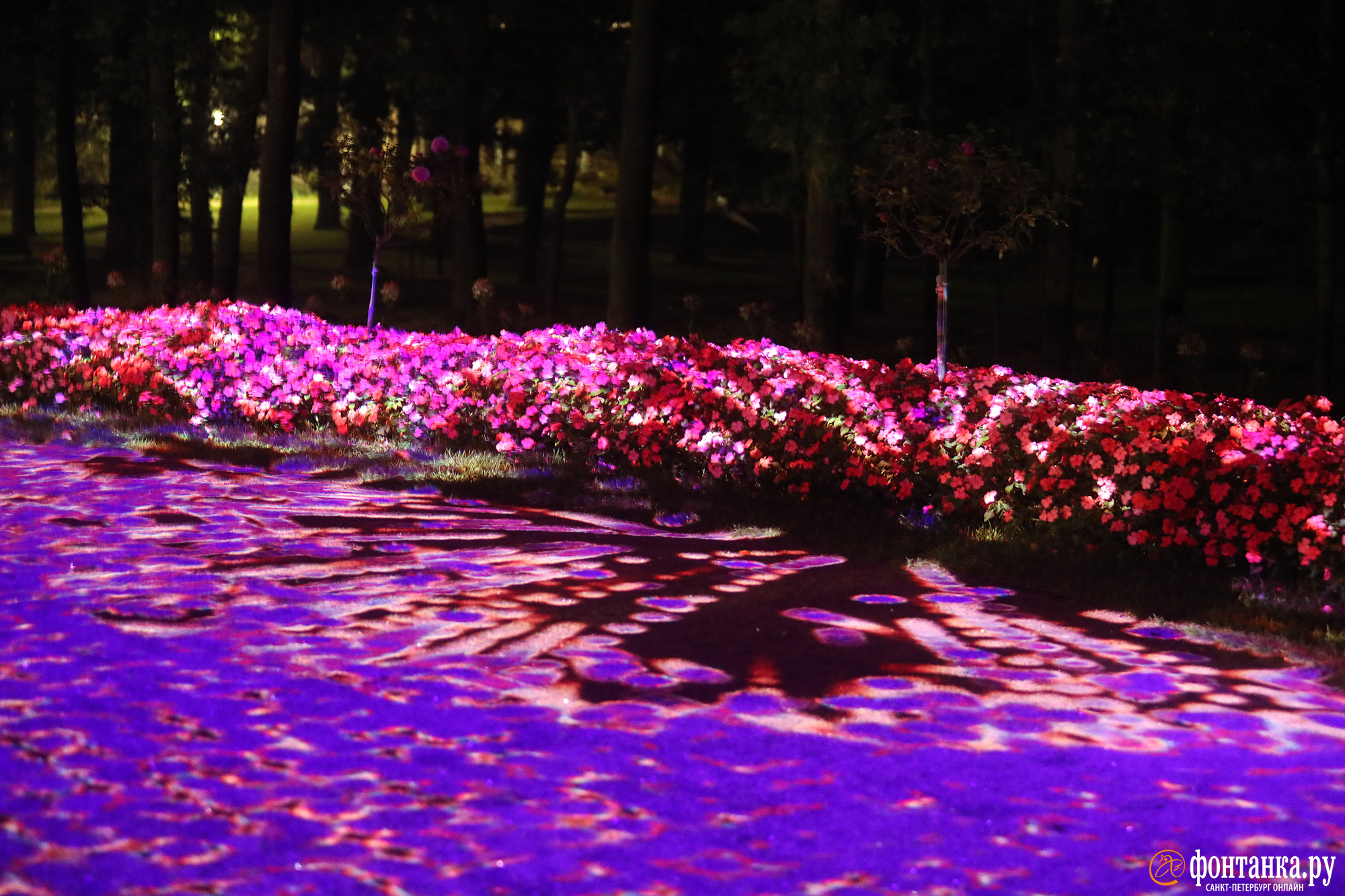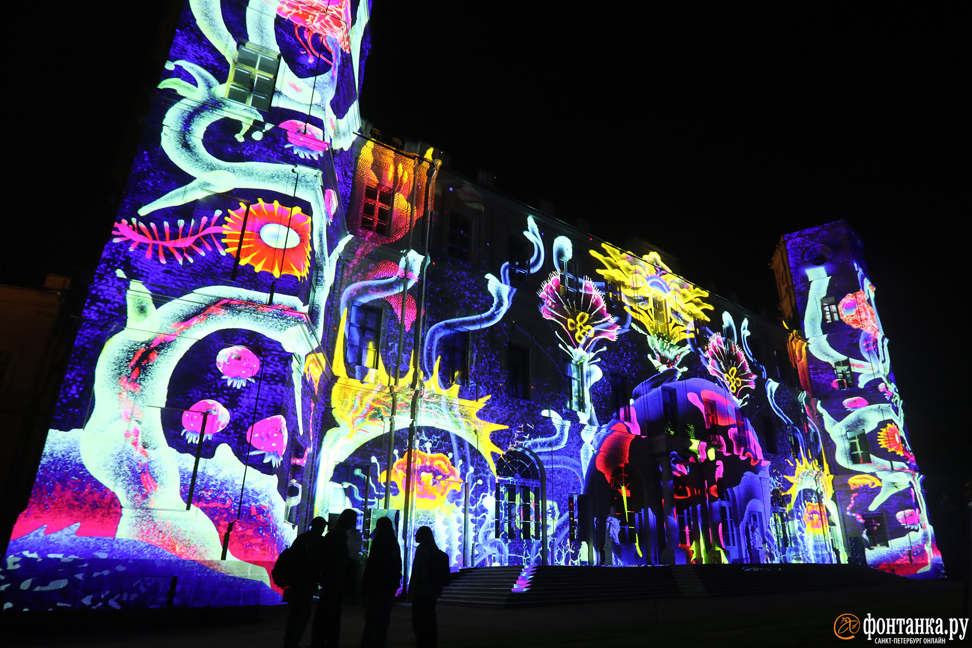 Стены с окнами в закрытом дворе привычно для мэппингов расползаются и наклоняются, ходят ходуном, исторгают слонов и носорогов (отсыл к гобелену Павла I в замке) и окрашиваются разными цветами — в контрастных сочетаниях. «Лего!» — бросают вслух местные фотографы, видя игру красных-синих деталек разных форм. На самом деле, почти угадали: работа венгерской студии EPER называется FRAGMENTS vol.2. Венгры — одни из немногих зарубежных участников фестиваля в этом году. Кроме них, в подборке мэппингов на фасаде (туда можно попасть, пройдя через дворец) показывают кислотных цветов анимацию Visionarium из Индонезии, работы из Испании и Китая. Еще одна работа китайских авторов — в парке, на Цветочной горке. Там можно потанцевать в лучах аудиовизуальной инсталляции Ethereal Generation, которая реагирует на движения человека и меняет форму и цвет яркого светового пятна, окруженного цветами.