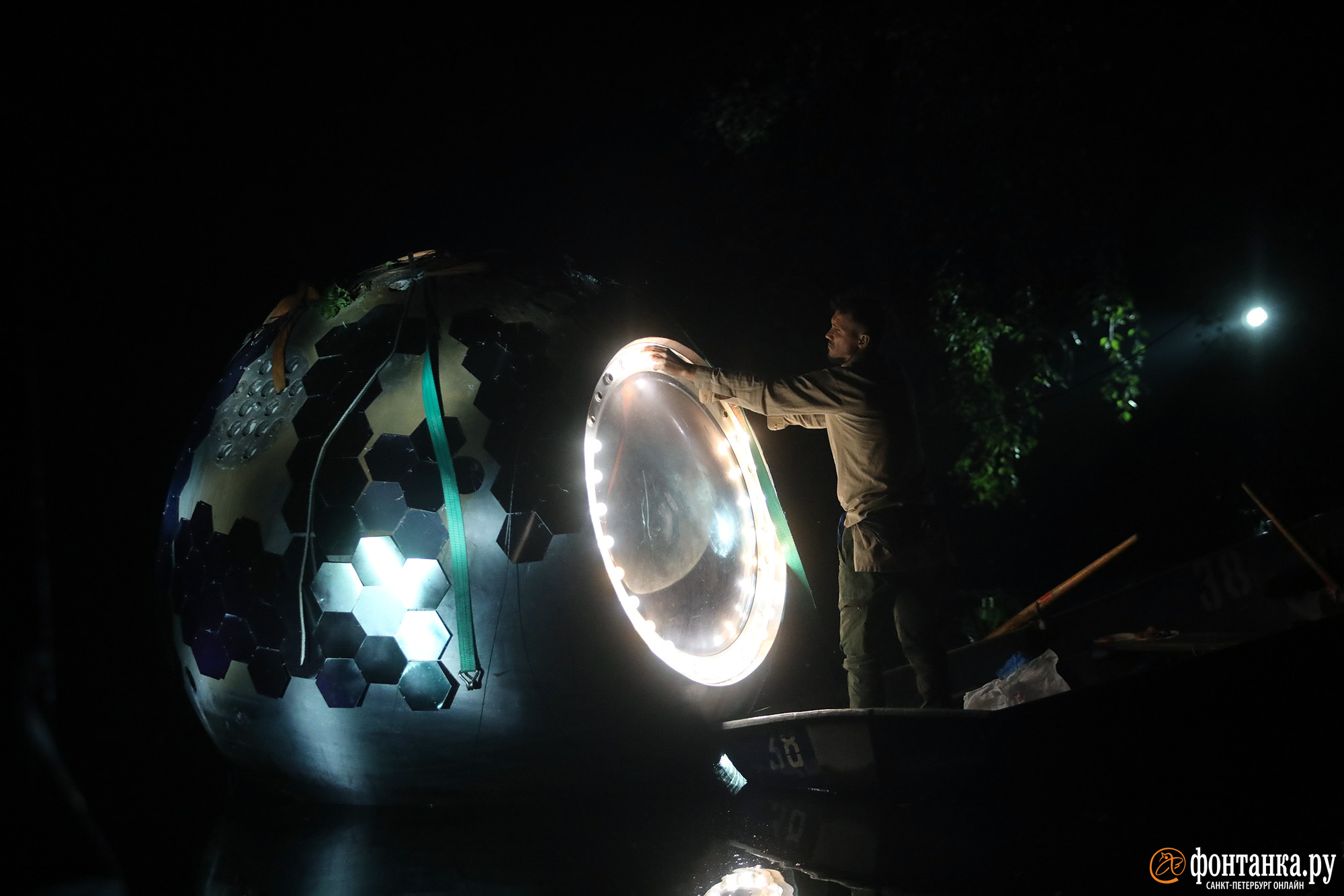 В это время рядом в небо взмывают прожектора — идет настройка центральной работы фестиваля, — «5х2х1,5» петербургской команды SmartLight, обычно работающей на концертах звезд, таких как Дима Билан и Тина Кузнецова. Чтобы переместить инсталляцию из неоновых трубок на середину залива, требуется катамаран.