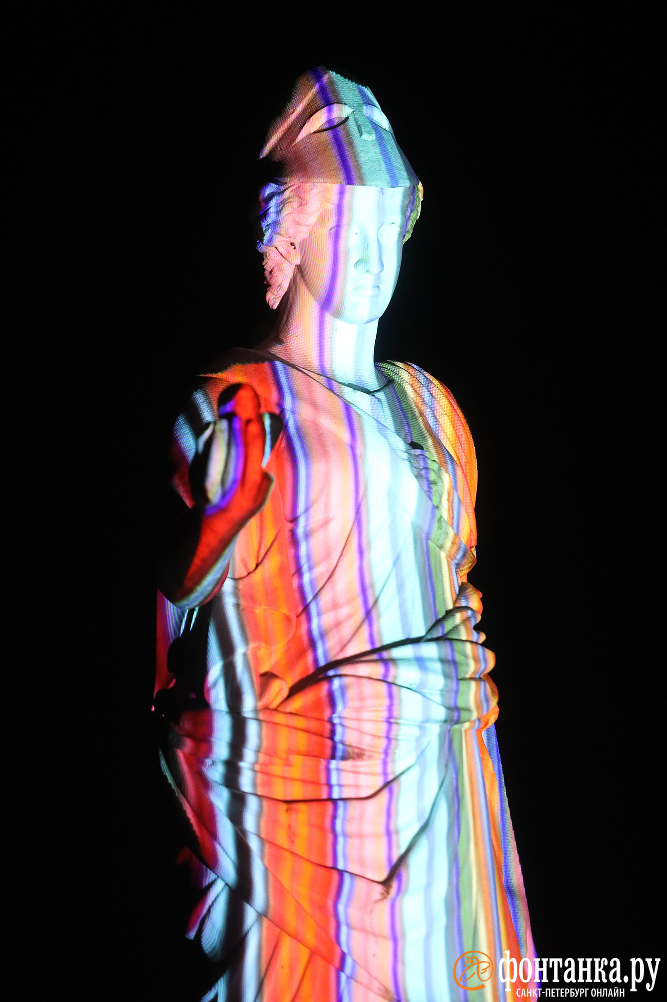 Впрочем, идти недалеко. Первые объекты — уже у входа: в Нижнем и Верхнем Голландском садах переливаются красным скульптуры («Марс, Сатир и Амазонка» — световая инсталляция москвичей Black Rays, уже подсвечивавших в Петербурге «дома на курьих ножках» на Смоленке). Но они — как бы «на новый год», то есть «на десерт» — как и в целом прогулка по парку. Начинать рекомендуется с мэппинга в Арсенальном каре и на фасаде Гатчинского дворца.