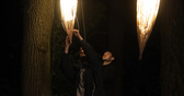 От красивых конструкций на воде идем в лес. А там, у моста, — «Момент перехода». Сначала кажется, что это название должно относиться к конструкции с крылышками на самом мосту — но нет, та работа именуется «Стержень». А «Момент перехода» — это светящиеся золотистые коконы, висящие на деревьях.