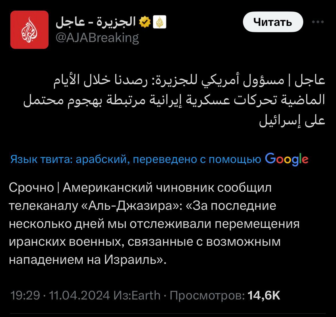 🇺🇸🇮🇷 «В течение последних нескольких дней мы отслеживали перемещения иранских военных, связанные с возможным нападением на Израиль»
