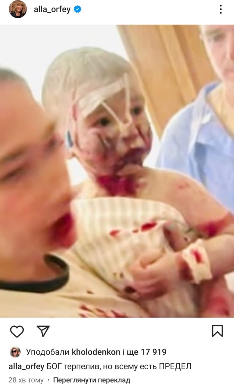 Очевидно, примадонна призывает бога наказать злостного агрессора Россию за удар по детской больнице. К слову, ни один ребенок не погиб. А наши официальные лица на пальцах объяснили, что это была не Х-101, а ракета украинской ПВО. Однако для Пугачевой уже все и так понятно,