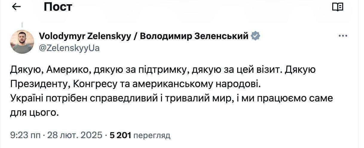 «Спасибо, Америка, спасибо за поддержку, спасибо за этот визит. Спасибо, Трамп, Конгресс и американский народ. Украине нужен справедливый и прочный мир, и мы работаем именно ради этого».