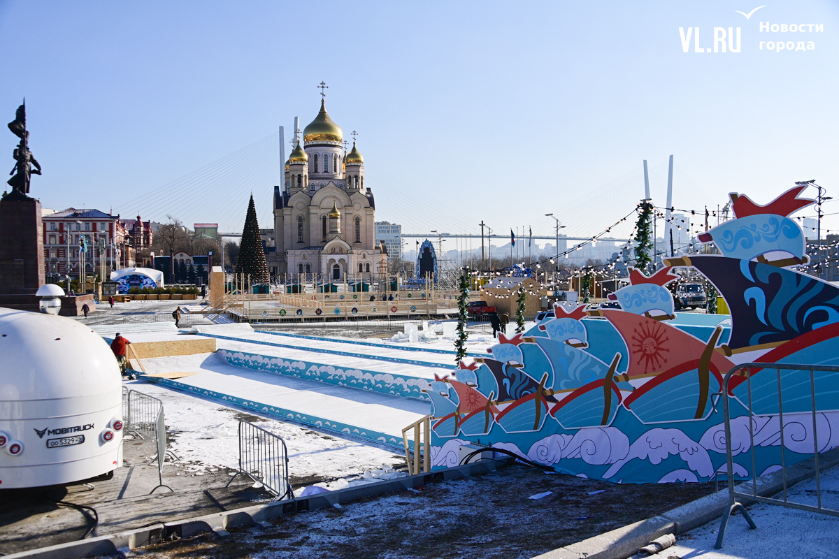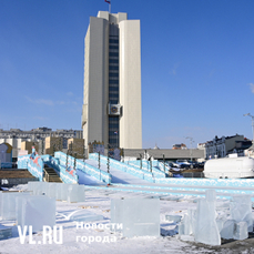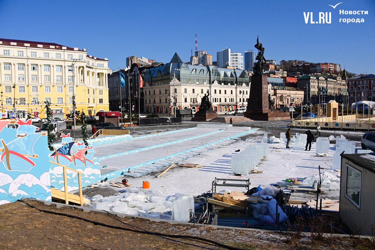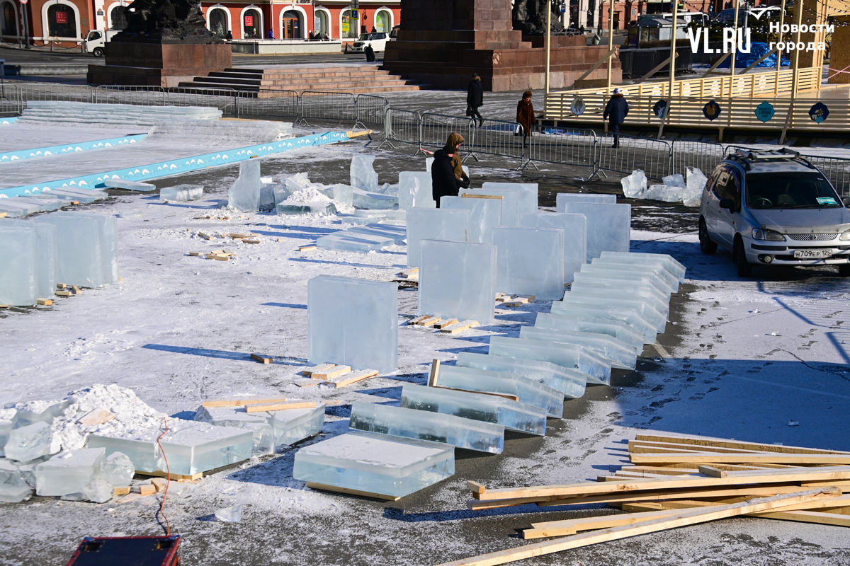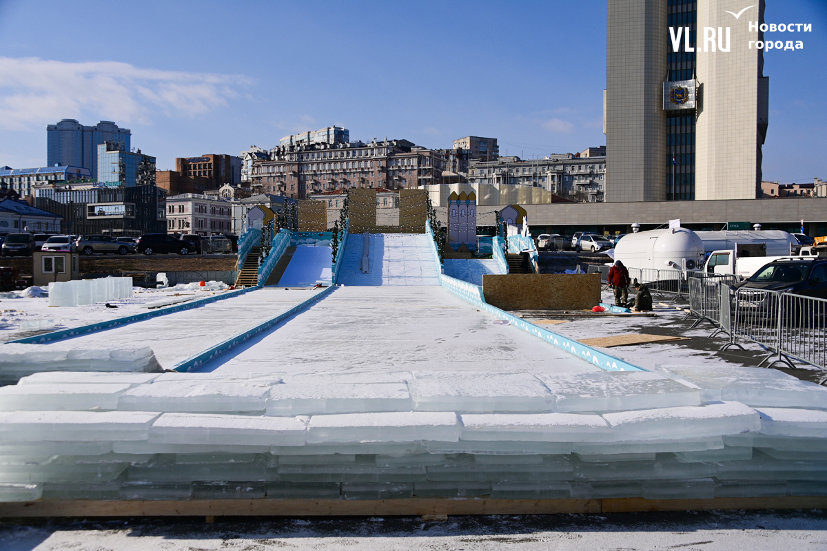 Монтаж ледяной горки на центральной площади Владивостока близится к финалу, но строители могут и не успеть к назначенной на 25 декабря дате сдачи объекта. Работы здесь ещё достаточно. Лёд на горке уложен, но не выровнен и не отполирован – хорошо видны стыки ледяных глыб. Самую короткую трассу для малышей рабочие сейчас заканчивают, монтируя на выкате ограничители из древесно-стружечных плит.