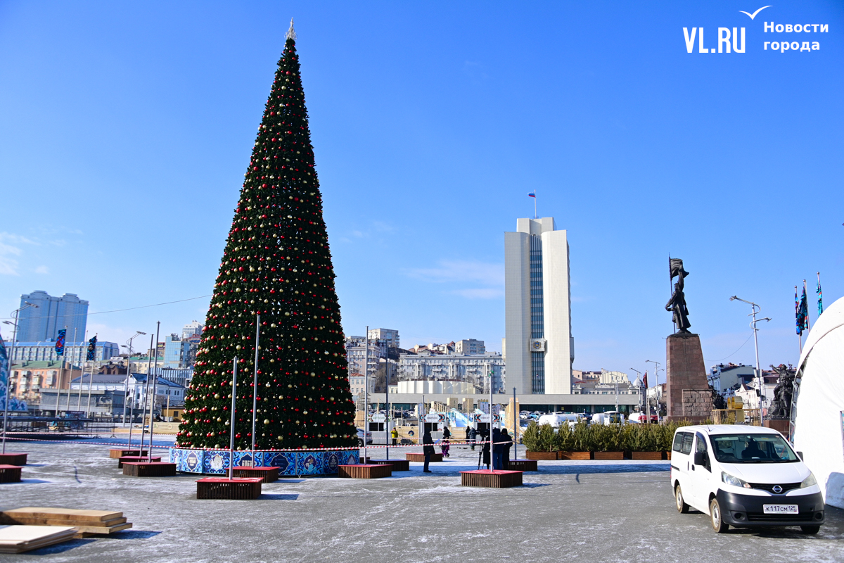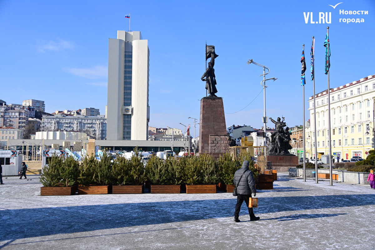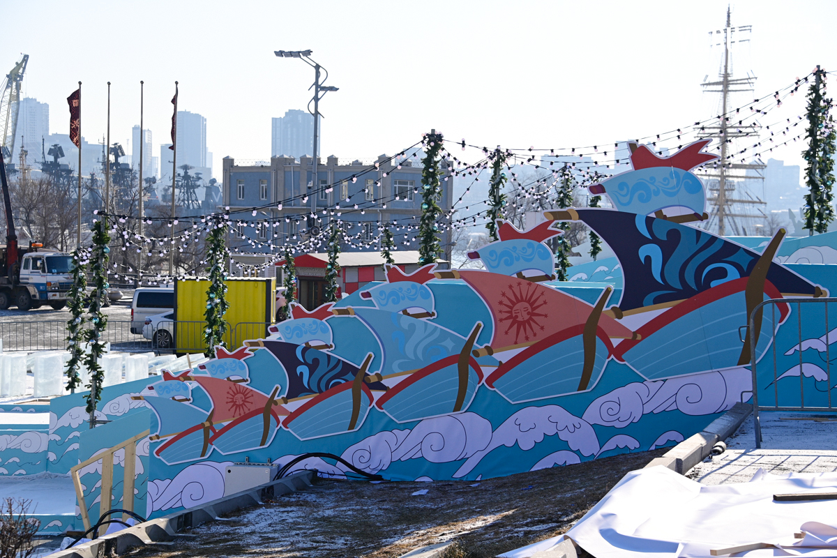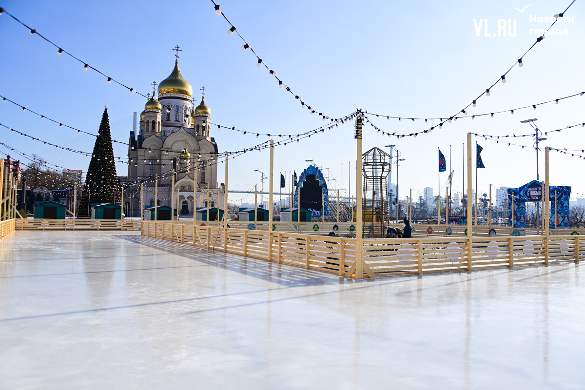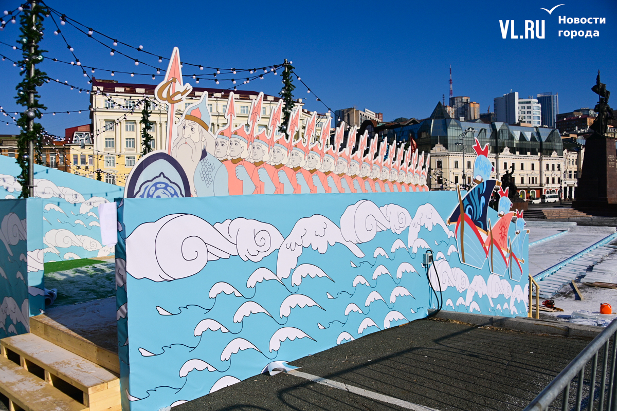 Монтаж ледяной горки на центральной площади Владивостока близится к финалу, но строители могут и не успеть к назначенной на 25 декабря дате сдачи объекта. Работы здесь ещё достаточно. Лёд на горке уложен, но не выровнен и не отполирован – хорошо видны стыки ледяных глыб. Самую короткую трассу для малышей рабочие сейчас заканчивают, монтируя на выкате ограничители из древесно-стружечных плит.