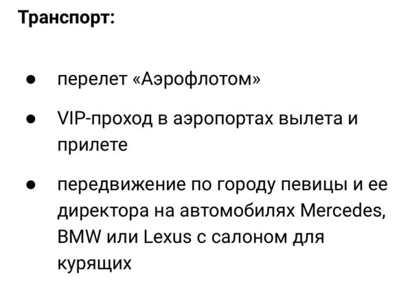 Стал известен райдер эпатажной певицы Ольги Бузовой. Оказывается, обязательным условием является выплата суточных в размере 7 тысяч рублей. Однако если другие пункты будут не выполнены, артистка грозит и вовсе отменить уже оплаченный концерт.