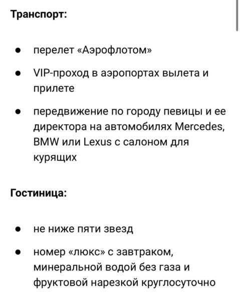 Помимо этого, в райдере Ольги Бузовой прописано множество других требований, которые также должны быть выполнены. Несоблюдение хотя бы одного из них может привести к отмене концерта. Такая строгость певицы вызывает неприятные эмоции среди организаторов, однако они вынуждены соглашаться на все условия, ведь никто не хочет потерять возможность увидеть звезду на живом выступлении.