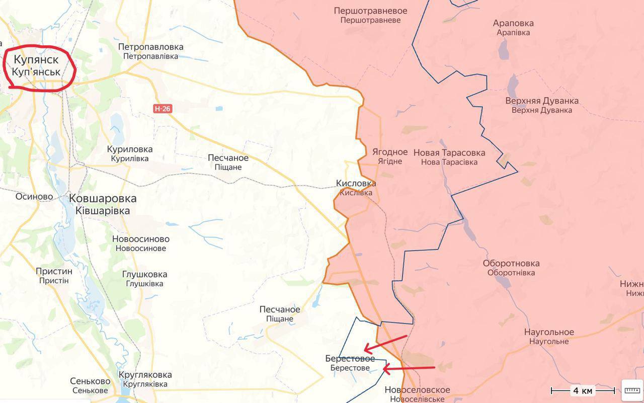 "Штурмовые подразделения ВС РФ прорвали оборону противника и вышли на рубеж н.п. Берестовое в Харьковской области под Купянском. Противник пытается контратаковать, на окраине населенного пункта идет встречный бой", — заявил Котенок.
