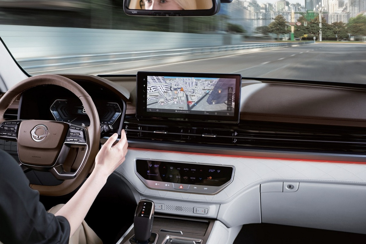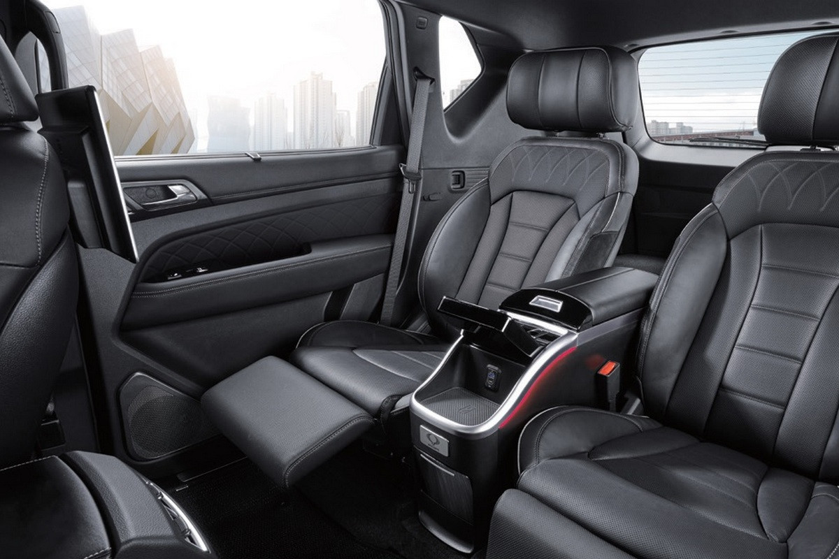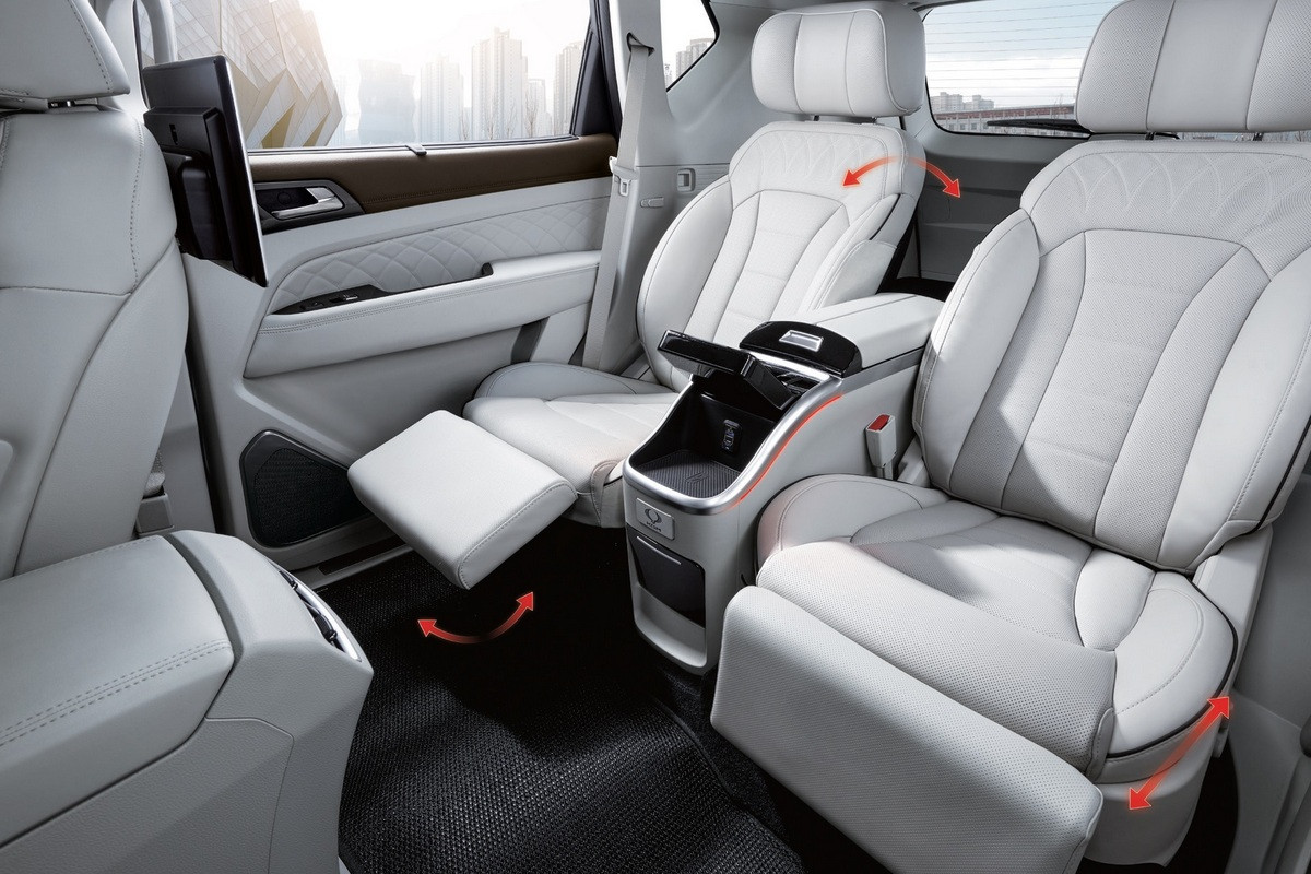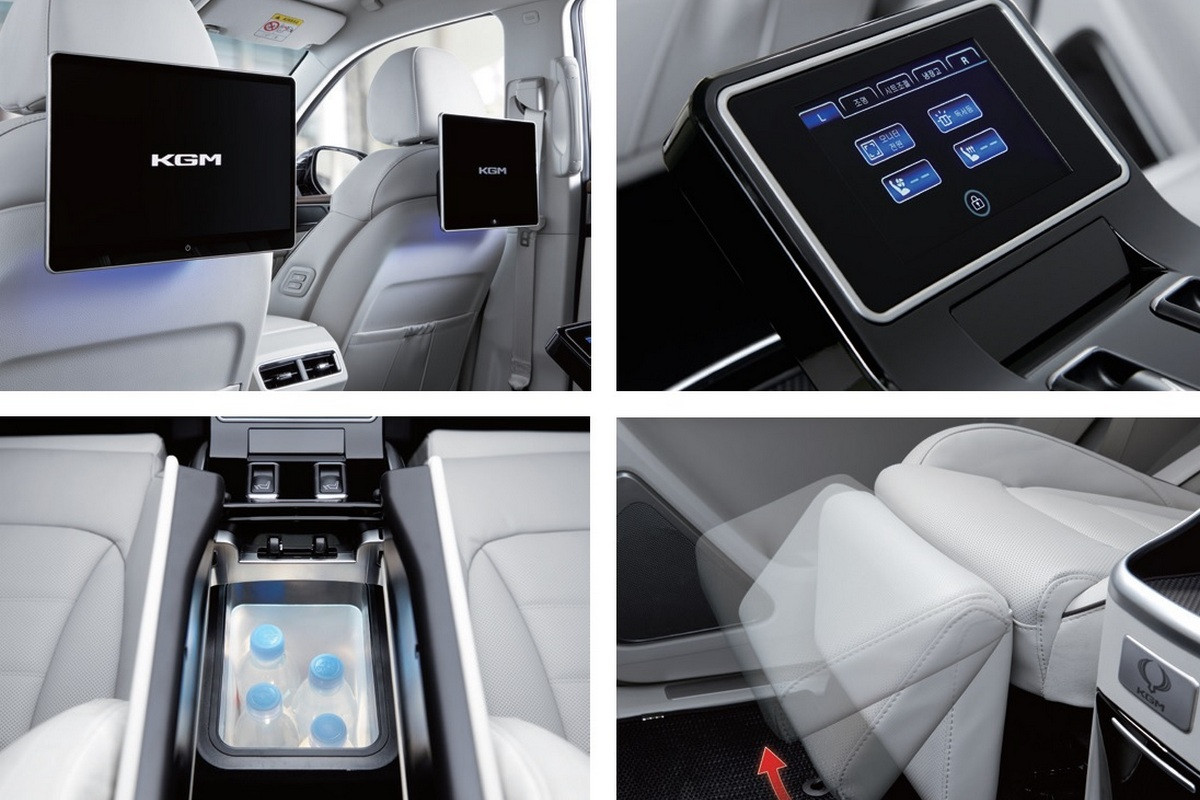 На галерке вместо сплошного дивана – два отдельных кресла с вентиляцией, массажером и подставками для ног; спинки могут откидываться назад. Между сиденьями установлена «тумба» с холодильником и сенсорной панелью для управления электрорегулировками и другими функциями, а под «пультом» имеется площадка для беспроводной зарядки гаджетов. Кроме того, KGM Rexton Summit получил пару 14-дюймовых планшетов – они крепятся к спинкам передних сидений.