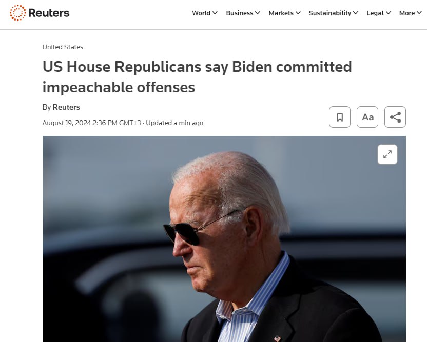 Члены Республиканской партии в палате представителей США заявили, что Байден совершил действия, которые могут подвести его к импичменту, сообщает Reuters.