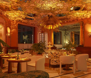 Бережно сохраненный интерьер напоминает о старых Grand Café с парижских бульваров и мишленовских ресторанах L’Ambroisie и Plaza Athenee. В центре внимания – потолочные росписи, венецианские зеркала и лепнина в стиле версальских дворцов, многоярусный фонтан, если верить легенде, созданный по эскизу Михаила Врубеля, и бронзовая решетка с изящным морским орнаментом с фабрики бронзовых художественных изделий придворных поставщиков Вишневских.