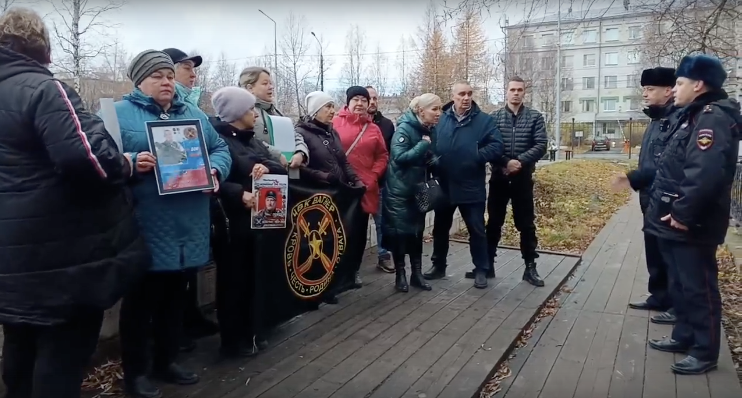 Родственники погибших бойцов ЧВК «Вагнер» из Архангельска попытались записать обращение к Владимиру Путину. Прямо во время съемки к ним подошли сотрудники полиции, попросили убрать флаг ЧВК и сообщили, что несанкционированные пикеты запрещены. Рассказываем, что известно об этом инциденте.