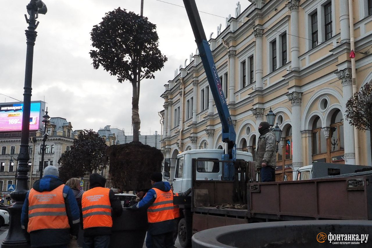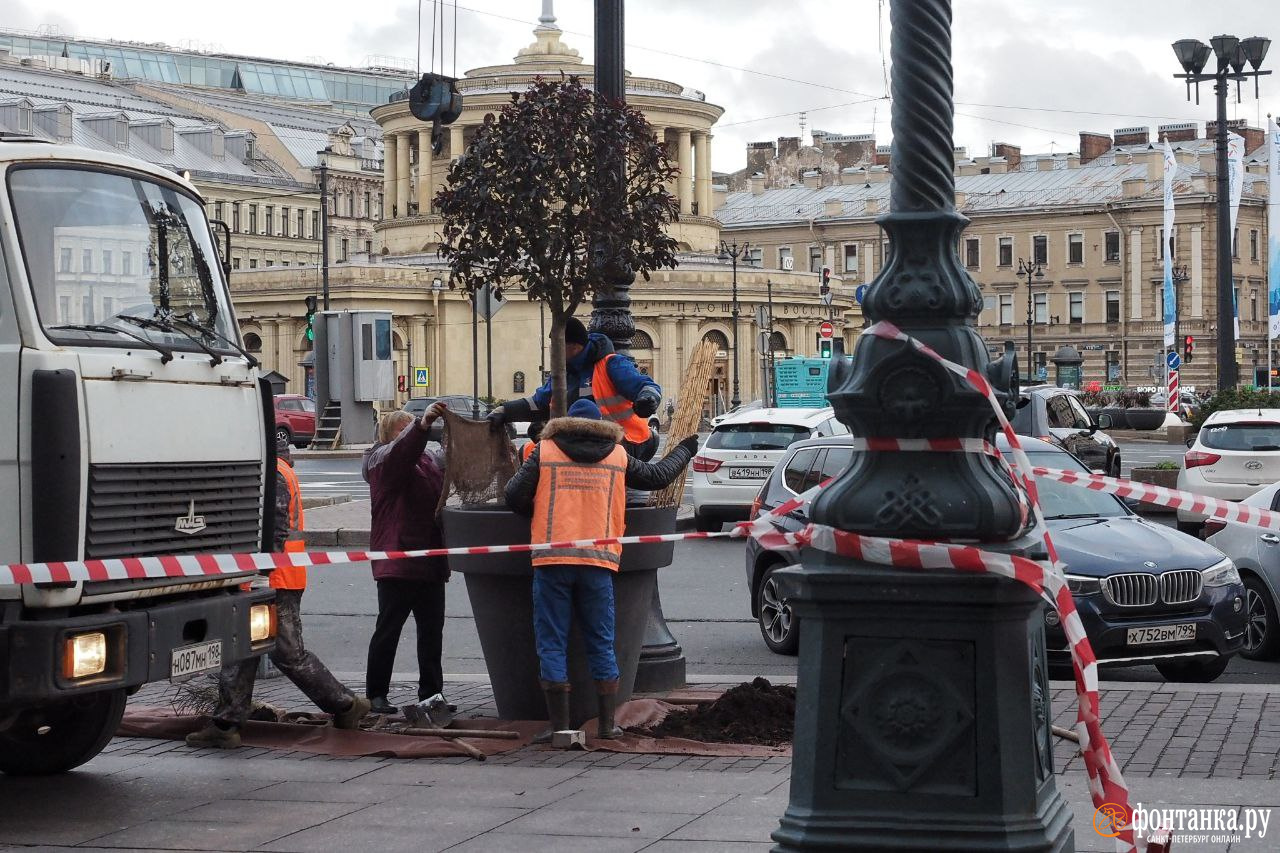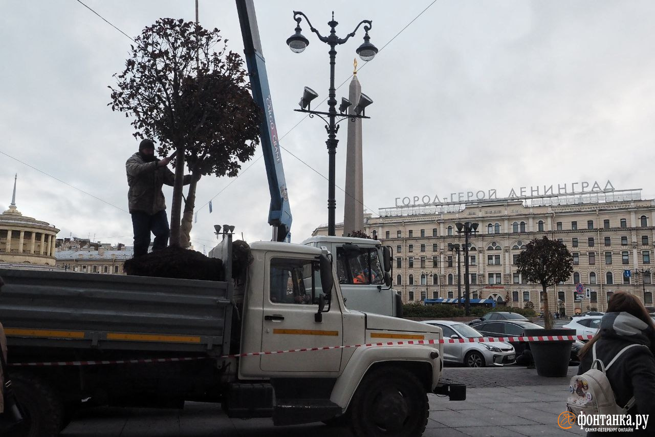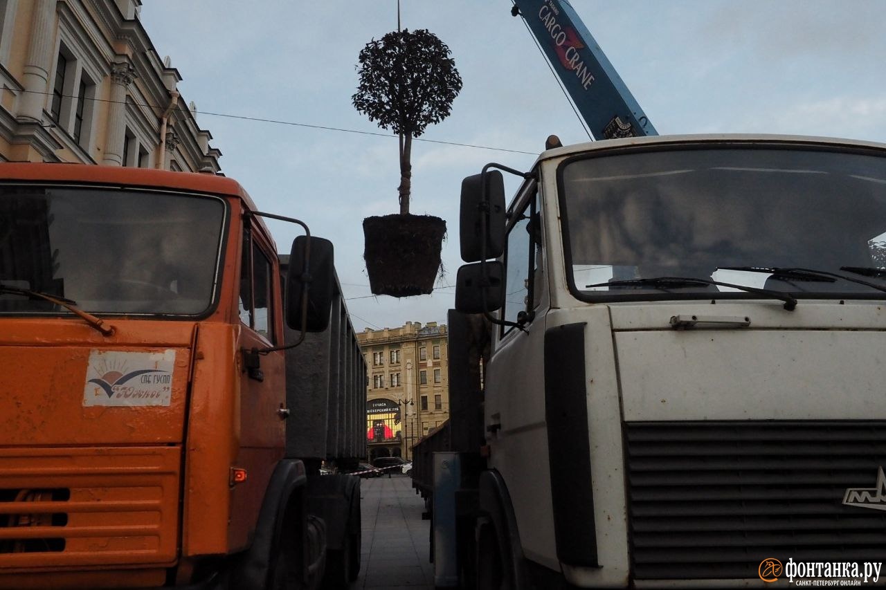 Из центра Петербурга начали увозить деревья в горшках на пересадку. До сада на Синем мосту дойдут в последнюю очередь.