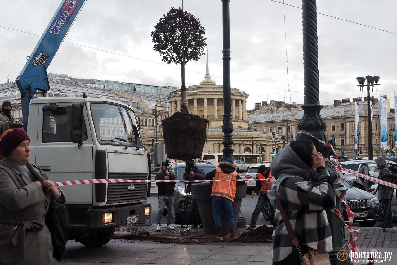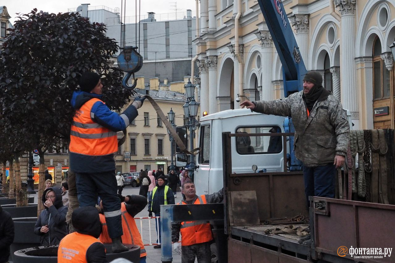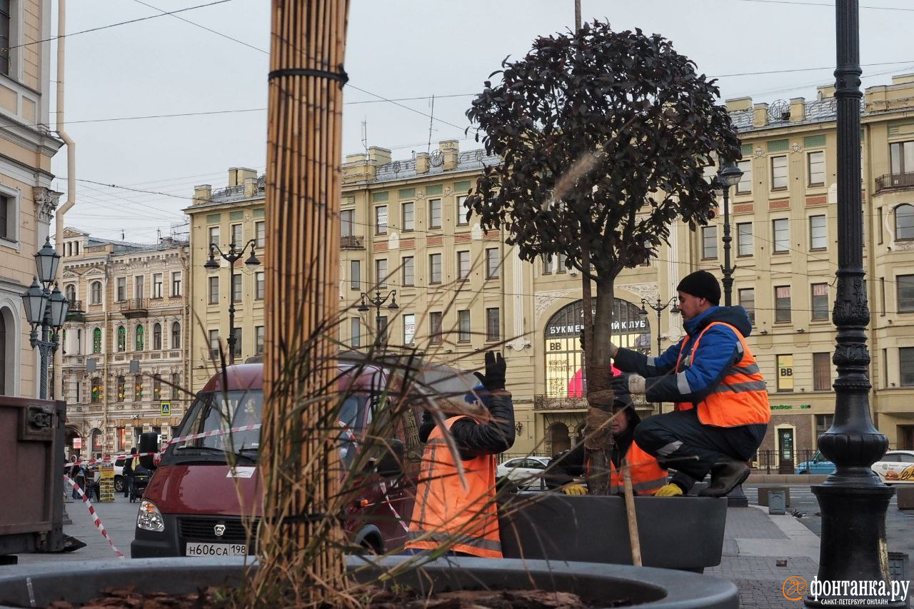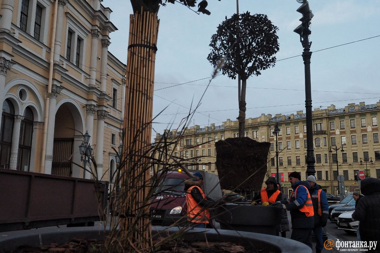 Из центра Петербурга начали увозить деревья в горшках на пересадку. До сада на Синем мосту дойдут в последнюю очередь.