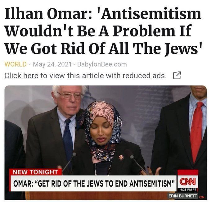 Член Палаты представителей США Ильхан Омар: "Антисемитизм не был бы проблемой, если бы мы избавились от всех евреев".