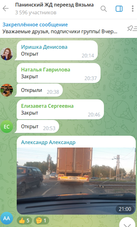 Ежедневно автомобилисты пытаются «проскочить» через шлагбаум. Активисты даже создали группу в Telegram-канале под названием «Панинский ЖД переезд Вязьма», где размещают актуальную информацию о текущей обстановке. В основном преобладают сообщения «закрыт – открыт (переезд — прим.ред.)», а также видеокадры, на которых водители стоят в пробках. Временной интервал этого «действа» непредсказуемый.