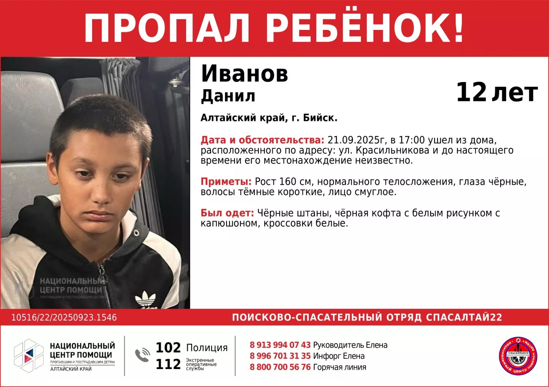 В Бийске пропал 12-летний мальчик. Об этом сообщает "СпасАлтай22" в своем сообществе во "ВКонтакте".