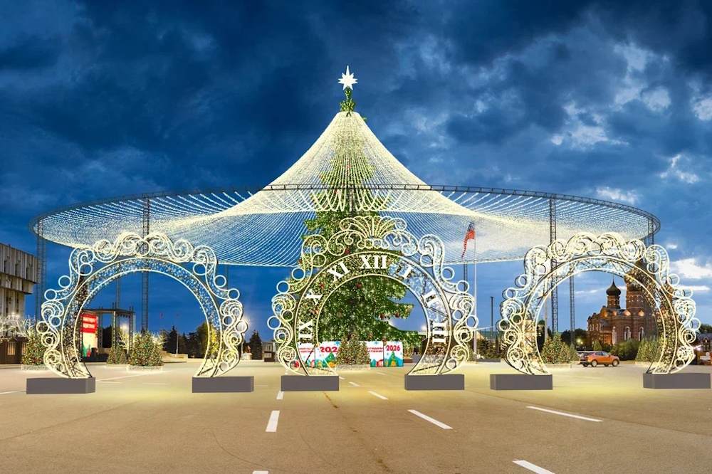 Ее установят вместе с игрушками в виде пряников, самоваров и подков, мультимедийным шатером, управляемой гирляндой и видеоэффектами. Всего туляков ждут 300 тысяч диодов и более 30 мультимедийных программ.