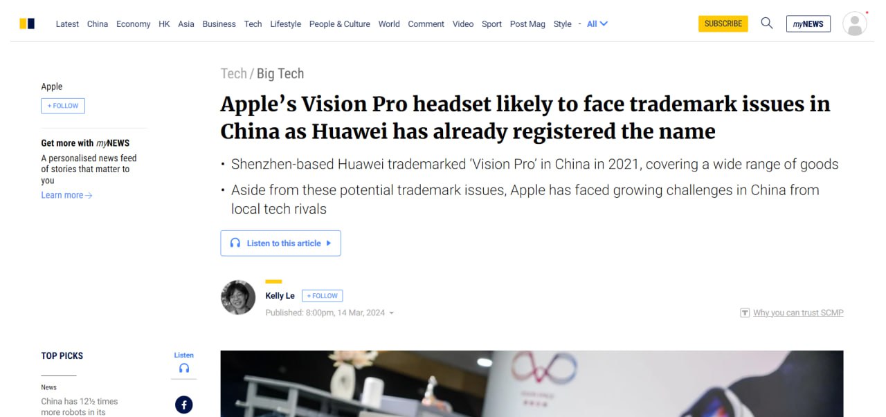 отказали в правах на товарный знак Vision Pro в Китае, пишут местные СМИ. Товарный знак несколько лет назад был зарегистрирован Huawei.
