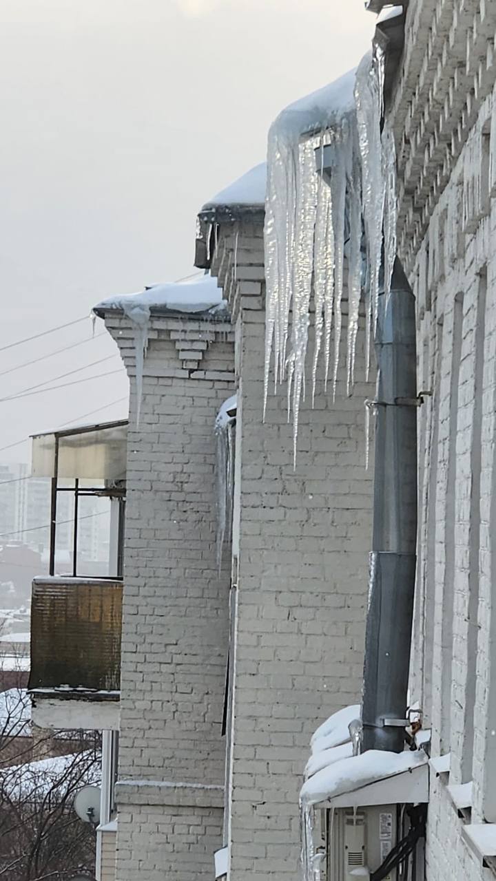 Глыбы льда висят прямо над детским садом на Покровке по адресу Казарменный переулок 8с2. Жуткими кадрами поделился подписчик. Снег не убирали аж с прошлого года и даже после циклона «Фрэнсис». В итоге на крыше дома образовалась корка льда слоем в 10 сантиметров, а сосульки длиной в 2 метра свисают с крыш. Есть риск обрушения, что угрожает людям и машинам снизу.