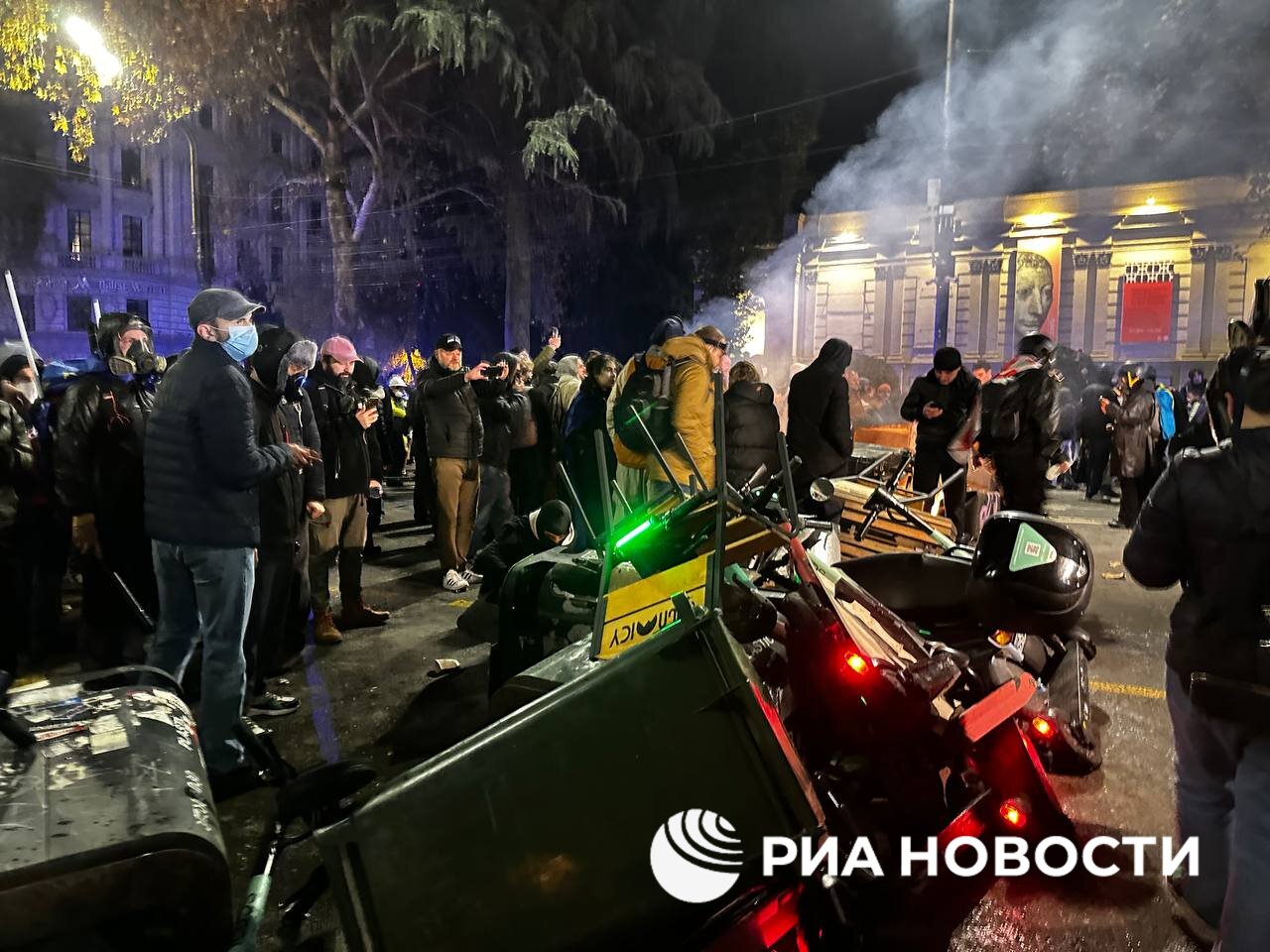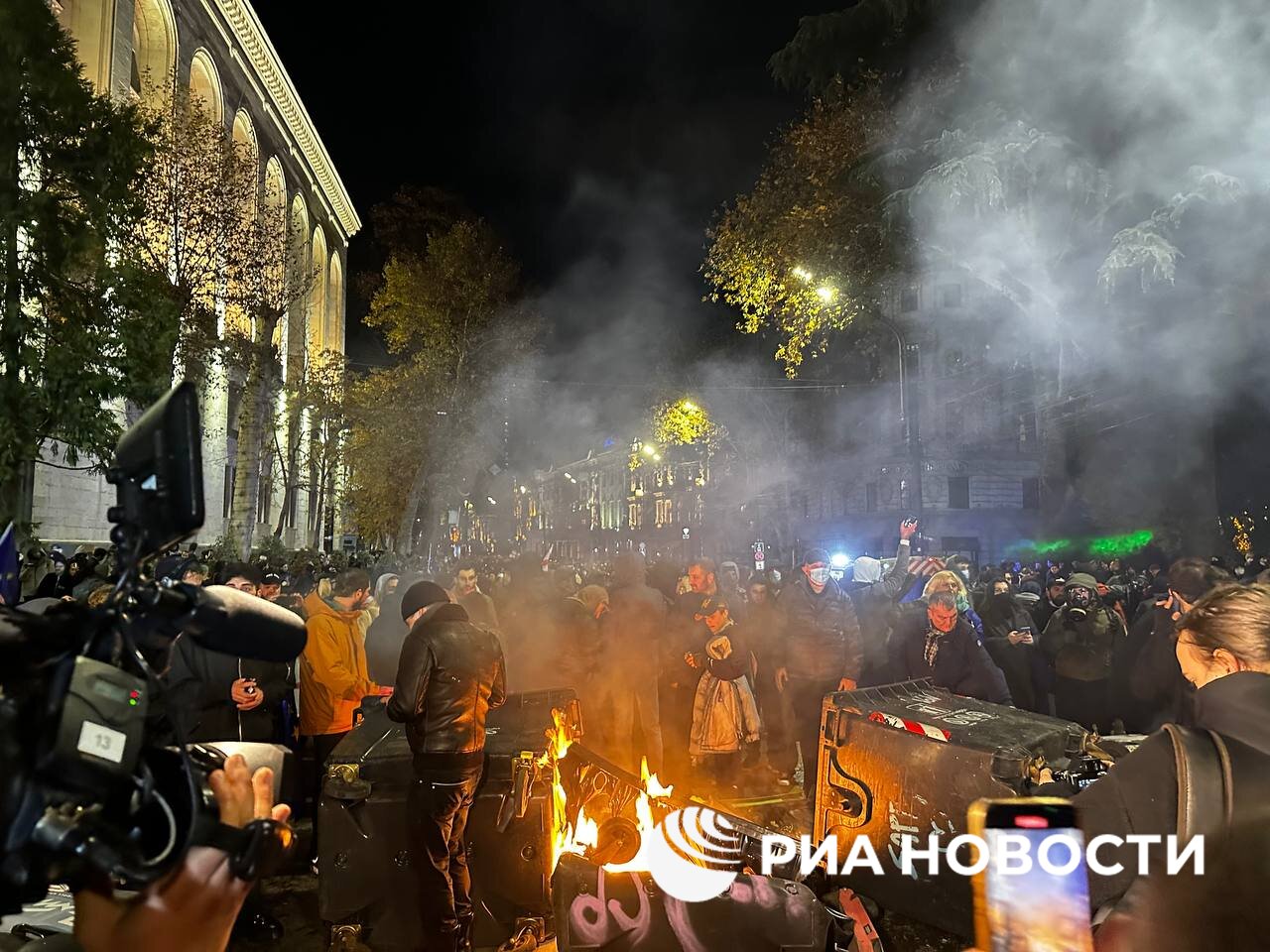 Спецназ в Тбилиси продолжает оттеснять участников акции протеста оппозиции, периодически применяя водомет, те возводят баррикады и жгут мусорные баки