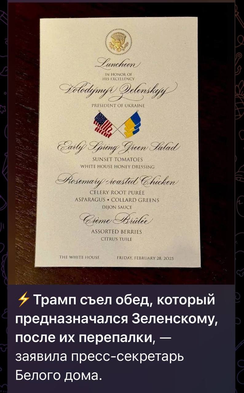 Пресс-секретарь Белого дома сообщила, что после того, как Зеленского оттуда вышвырнули, Дональд Трамп с удовольствием съел приготовленный для Зеленского торжественный обед.